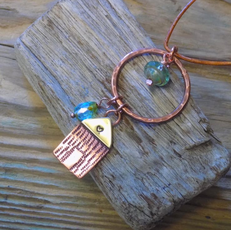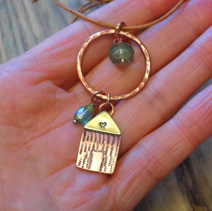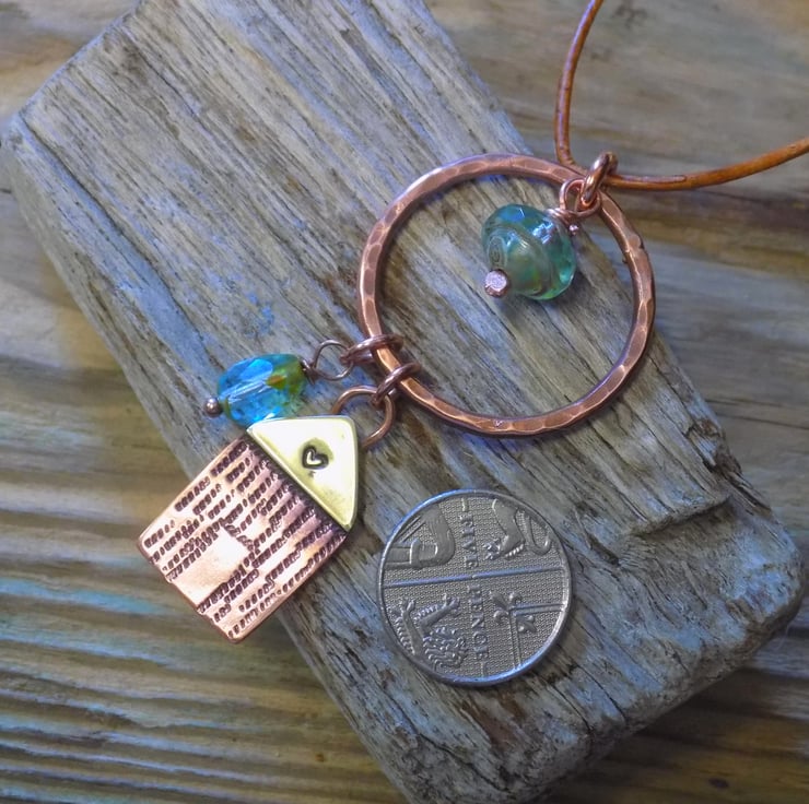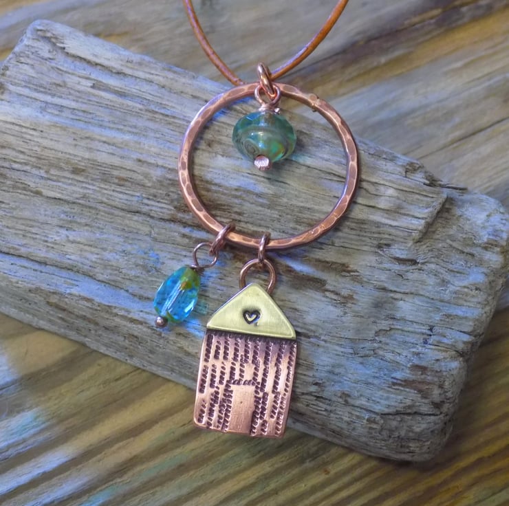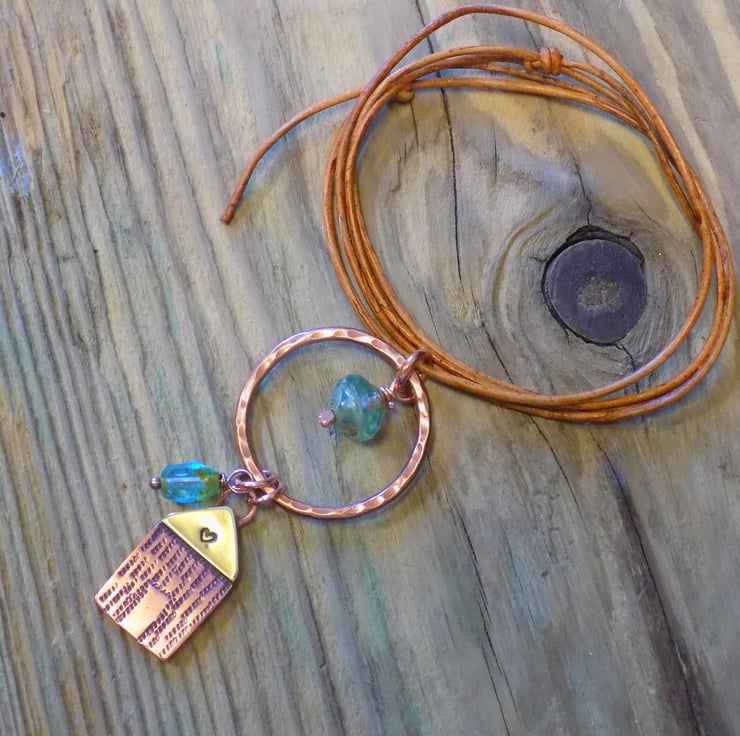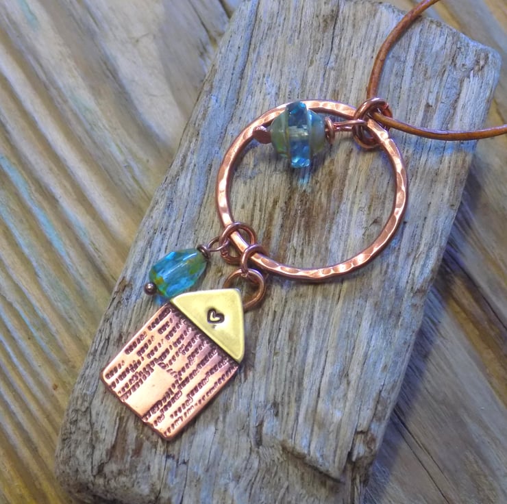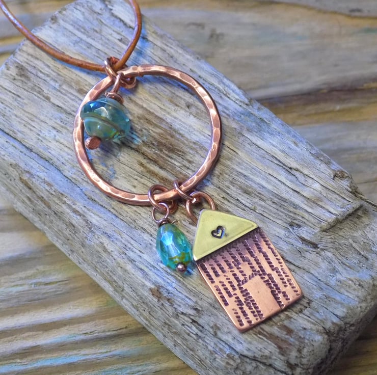 A pendant made from a thick copper dappled hoop on which hangs a cute little copper and brass beach hut style charm. Aqua coloured Czech glass beads compliment the copper beautifully.Simply hung on an adjustable knot necklace in vintage brown leather cord.