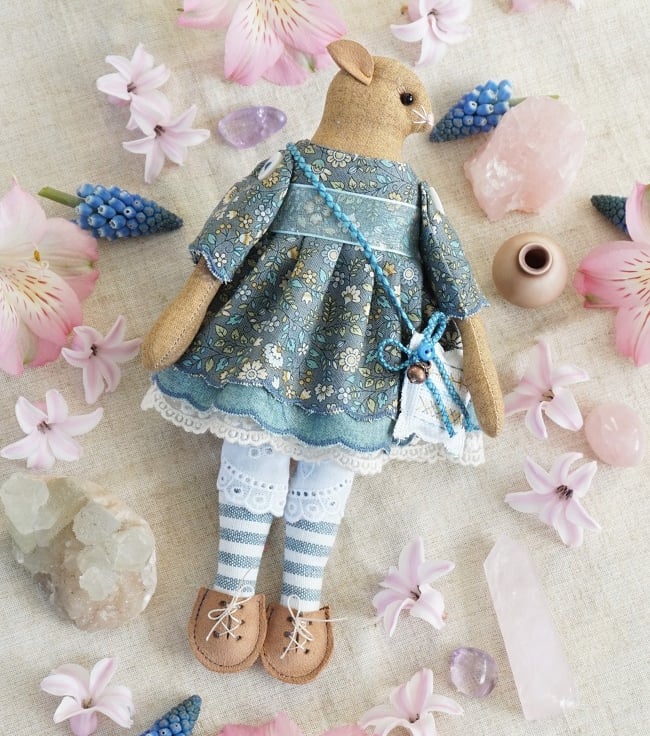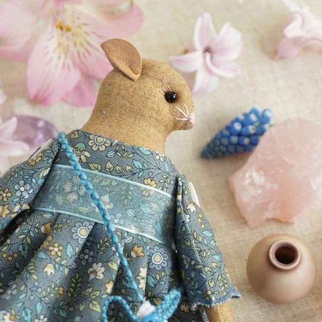This is Sukie, a tiny harvest mouse. She is a hand embroidered mouse with little leather ears and tail. She is dressed in a beautiful quilting cotton with coordinating underskirts and cotton lace bloomers. Her dress is finished with organza ribbon, tiny buttons and little leather shoes.