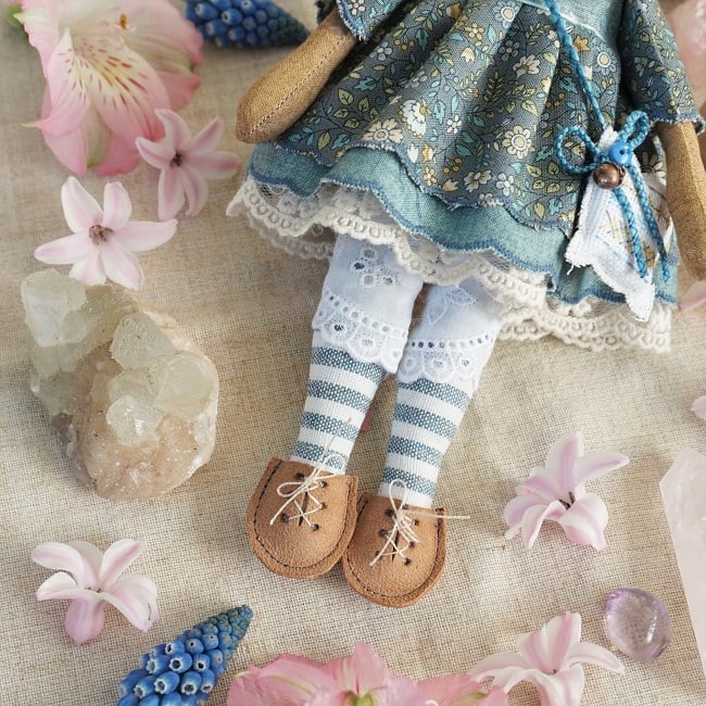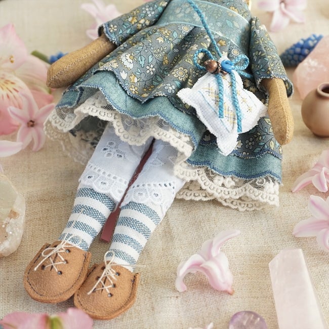 She is softly stuffed with lavender in her stuffing for a gentle scent and she has a tiny smokey quartz crystal at her heart for strength. She has a brass ring to her back in case you want to place her on the wall.