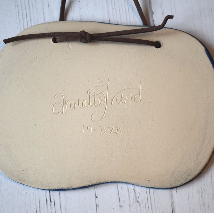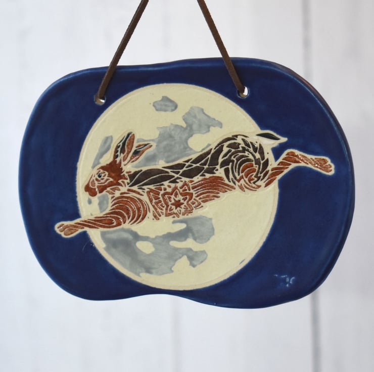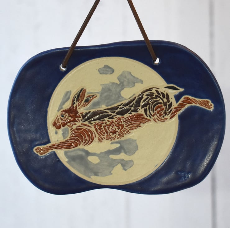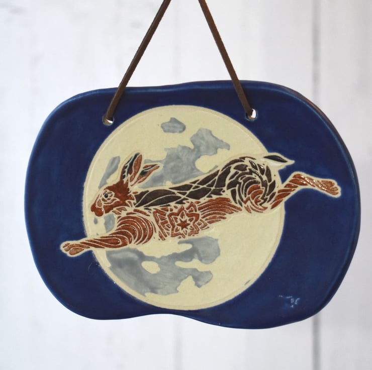 An organically shaped plaque measuring 15cm wide and 11cm high with a stencilled hare image in satin matte glaze.