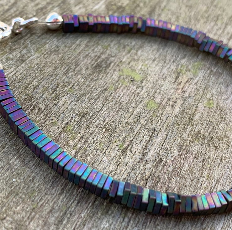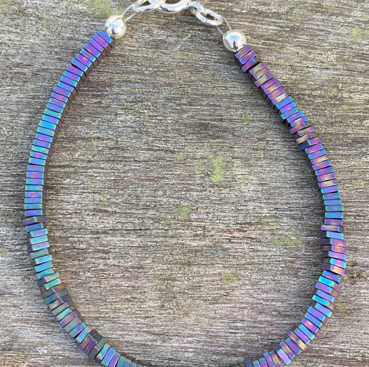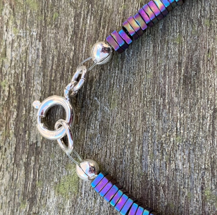 Semi precious flat square Hematite beads on clear filament wire with sterling silver findings including bolt clasp. Bolt clasp has 925 hallmark.