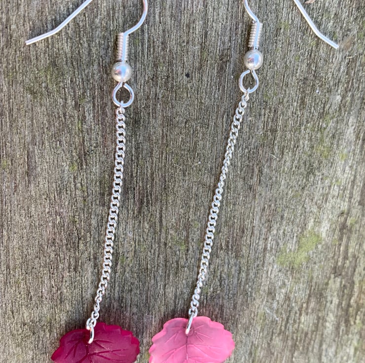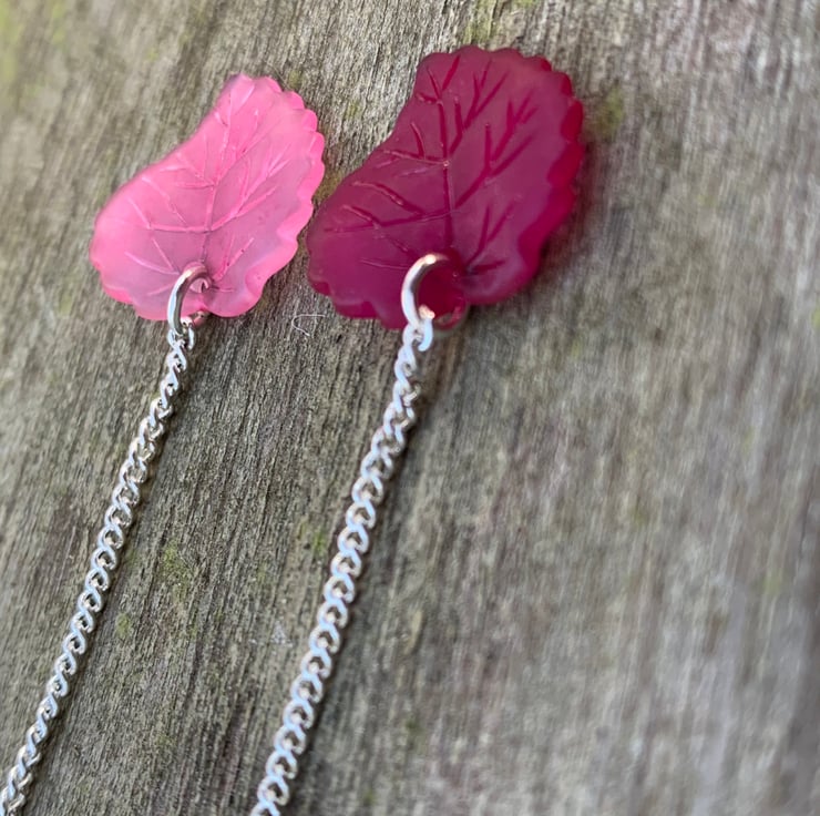 Mismatch light and fuchsia pink plastic leaf earrings hanging from silver plated chain with silver plated findings.