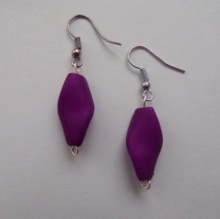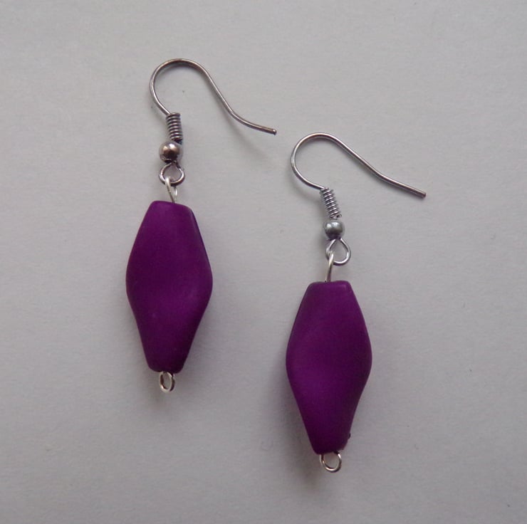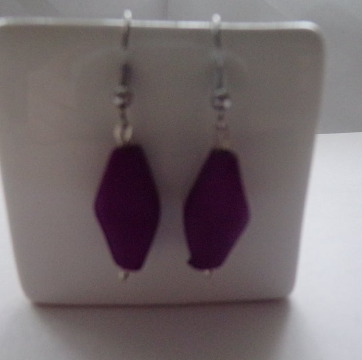 Earrings, Purple Earrings. Lovely deep purple bead on a nickle free silver plated earwire. The length of the drop is approximately 2cm. The earrings will be sent to you in a pretty fabric bag, tied with ribbon (material may differ from that shown in picture).