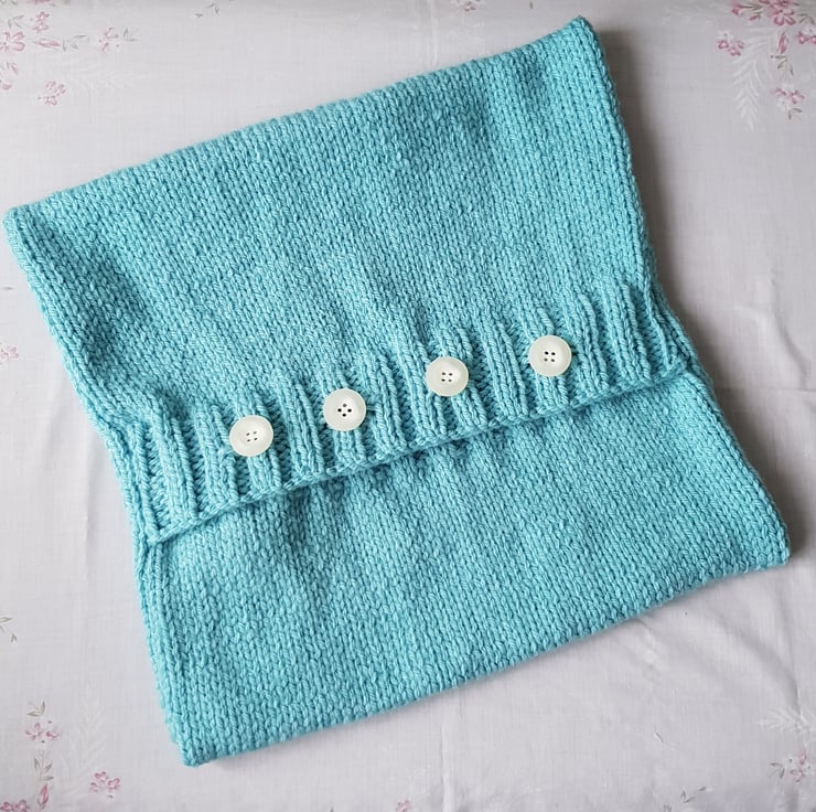 Bunny cushion cover, hand-knitted in chunky wool, fastened with four large buttons on the back.
