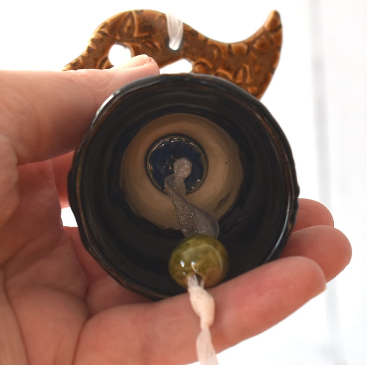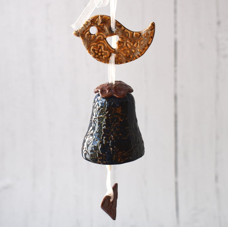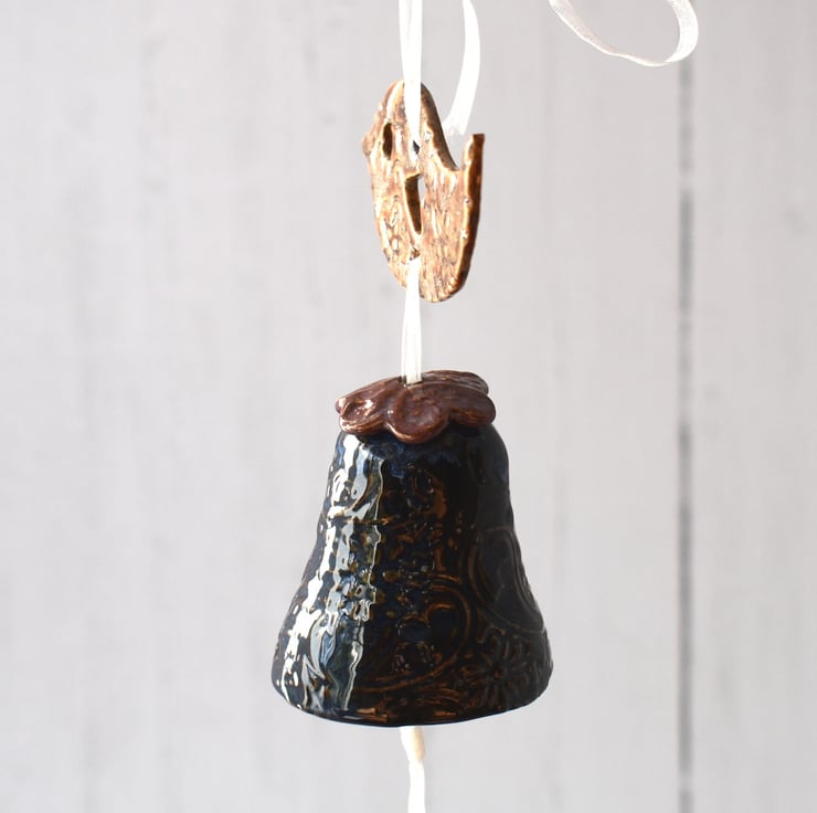 A hand made textured ceramic bell in several parts threaded on a white gauze ribbon. The bell itself is approximately 6.5cm tall and the parts in total are around 15cm.