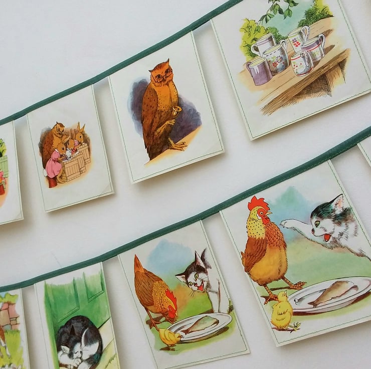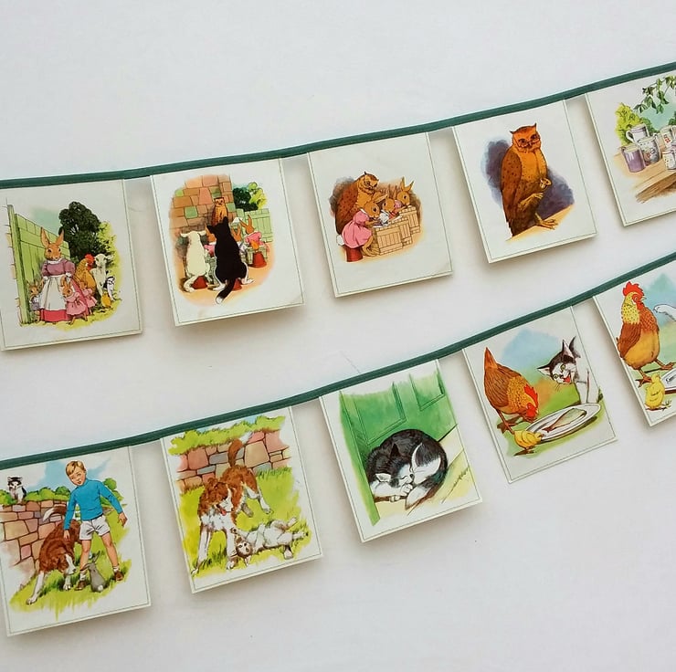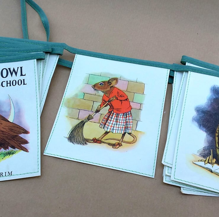 This is a length of bunting made from an entire vintage Blackberry Farm book - 'Ernest Owl Starts a School'. There are 16 whole page flags measuring 11cm x 14cm hung 3cm apart, giving a total length of 280cm (includes 30cm each end for tying).The images hand to the front and the story tothe back. As the whole book is used the story can still be read.