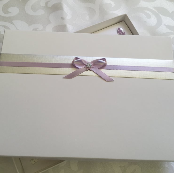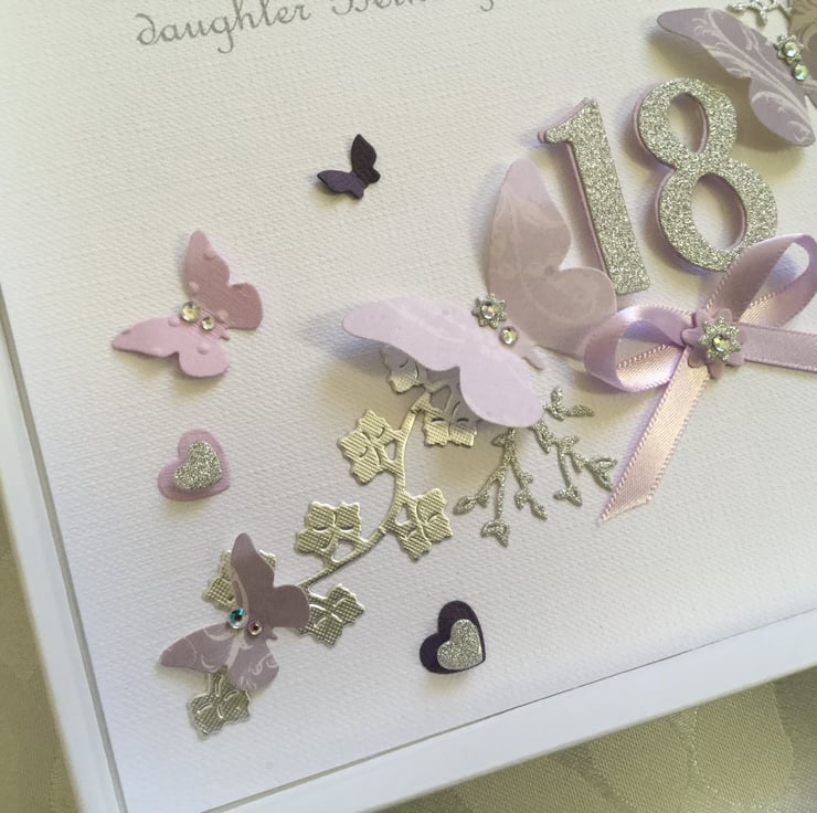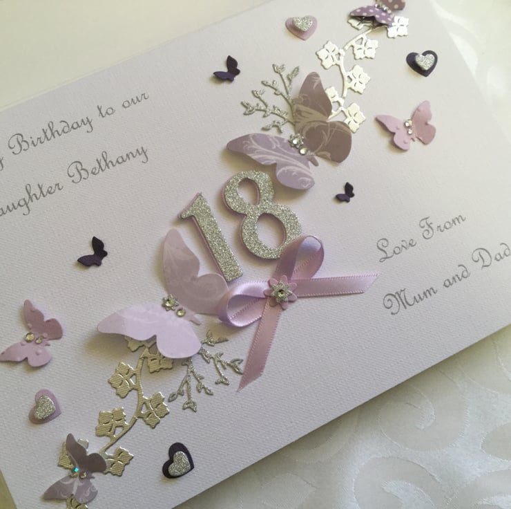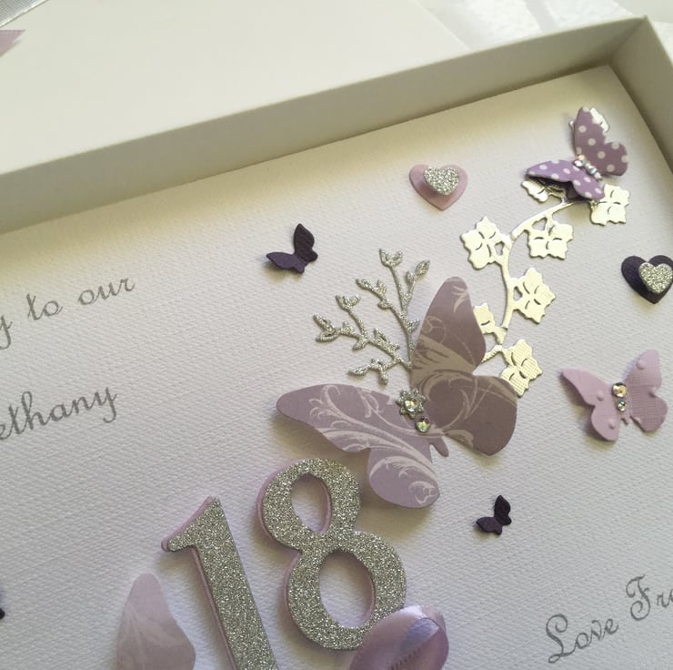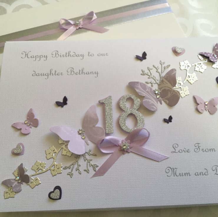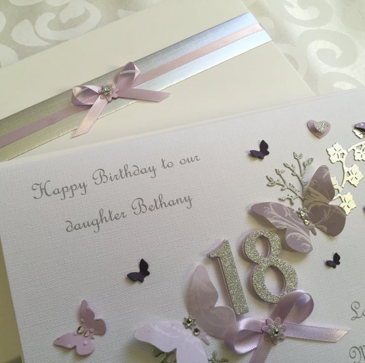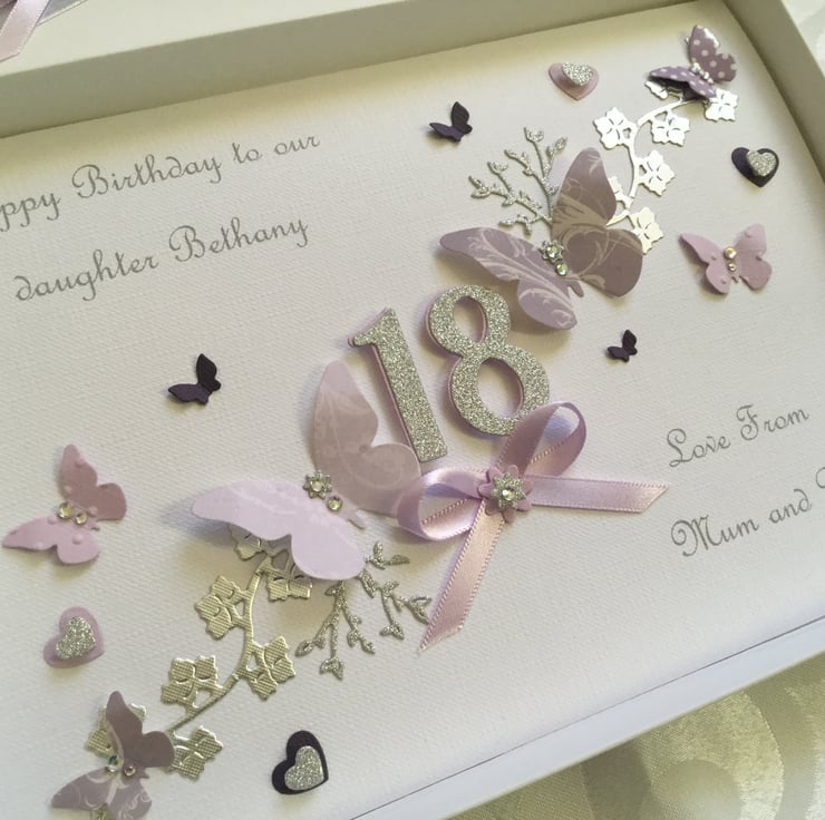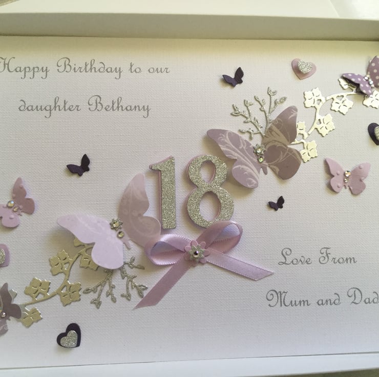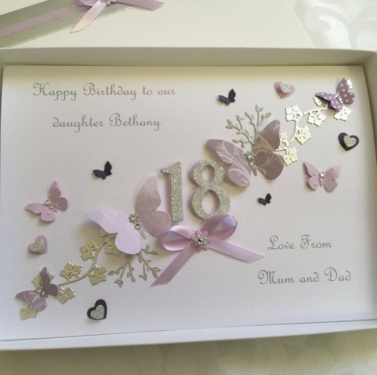 This handmade gift boxed card is A5 in size (210mm x 150mm) and can be personalised for any special birthday. It is on 300gsm cardstock and decorated with ribbons and gems. It comes in the matching decorated box and makes a wonderful keepsake.