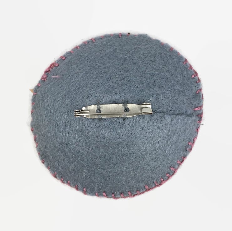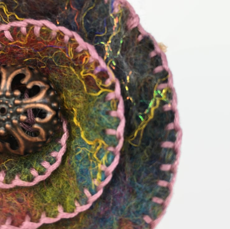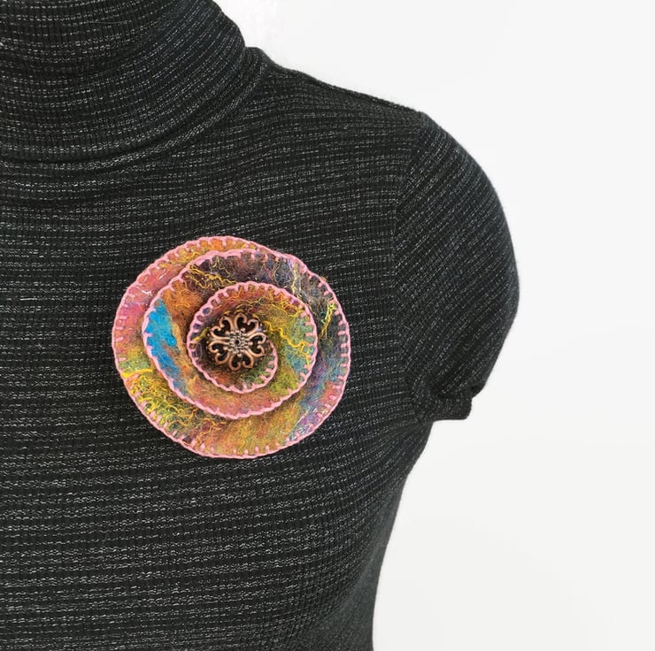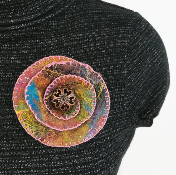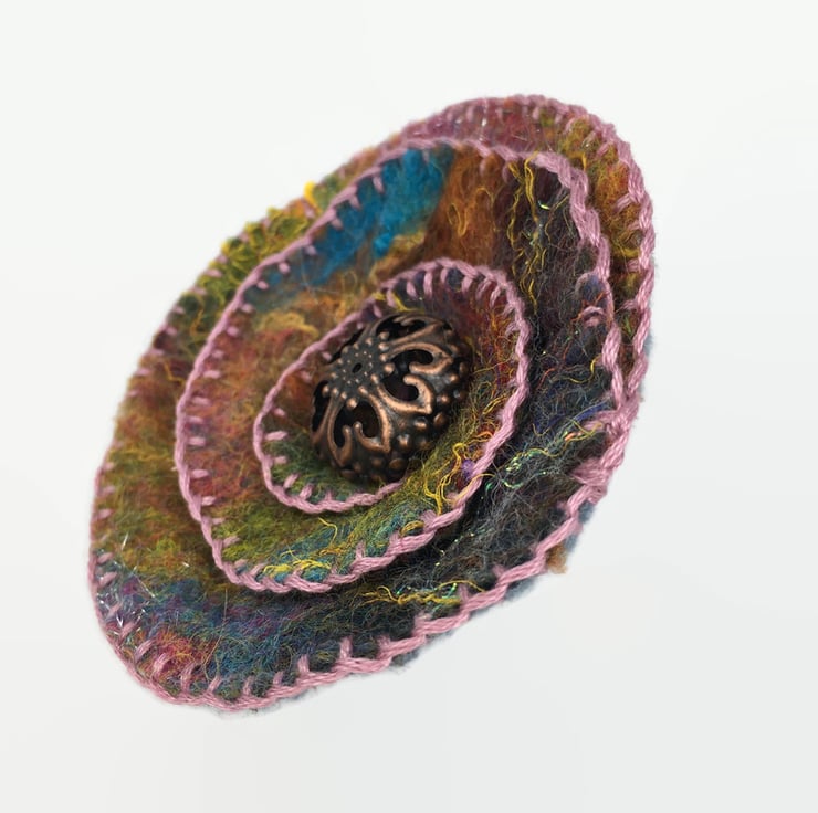 This brooch or corsage has been created using a piece of hand made multicoloured felt. Woollen fibres in various colours and embellished on the surface with various silk and glittery angelina fibres have been wet felted to produce a piece of flat felt. This felt has then been cut and stitched to produce a slightly conical floral form. The edges have been finished by blanket stitching using pale pink embroidery floss. At the centre, a large "antique copper" bead has been added. The brooch is backed with grey commercial felt and a silver tone brooch pin added to the reverse.