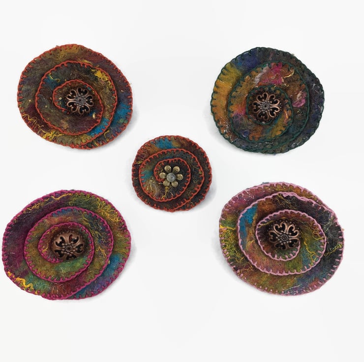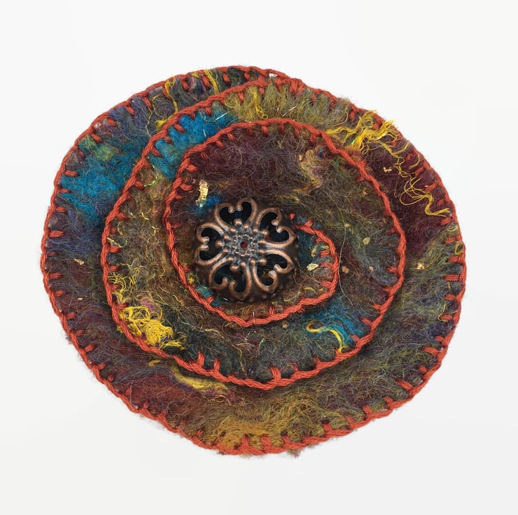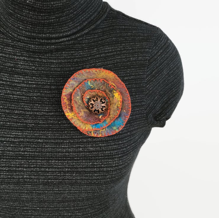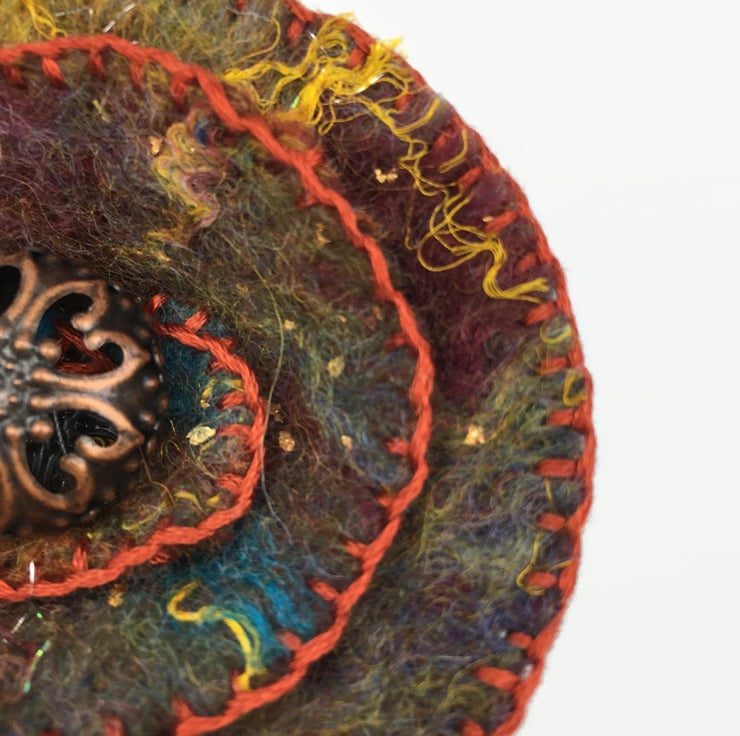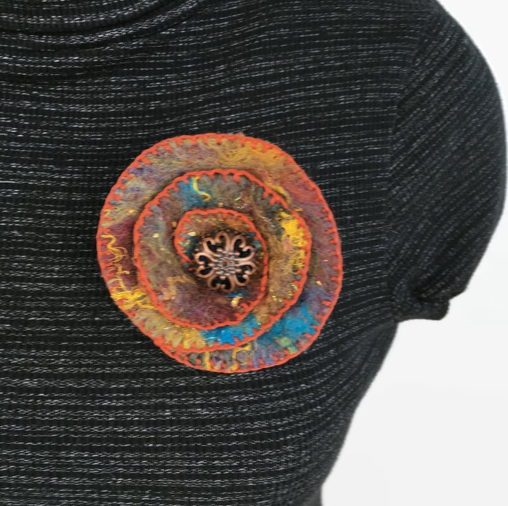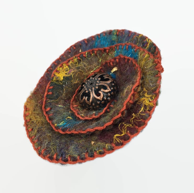 Multicoloured woollen fibres, embellished with various silk and glittery angelina fibres, has been wet felted. The brooch has been formed into a slightly conical, floral shape. The edges have been finished using a rust coloured embroidery floss stitched in a blanket stitch. A large "antique copper' coloured bead has been added to the centre. The brooch has been backed with a grey coloured commercial felt and a brooch pin added to the reverse.