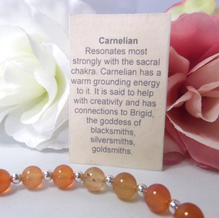 Carnelian resonates most strongly with the sacral chakra. It is said to have a warm grounding energy to it. It is said to help with creativity and has connections to Brigid, the goddess of blacksmiths, silversmiths & goldsmiths.