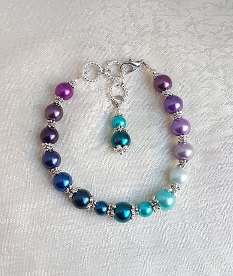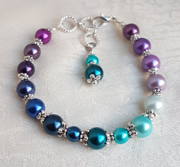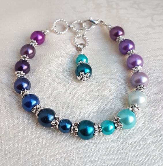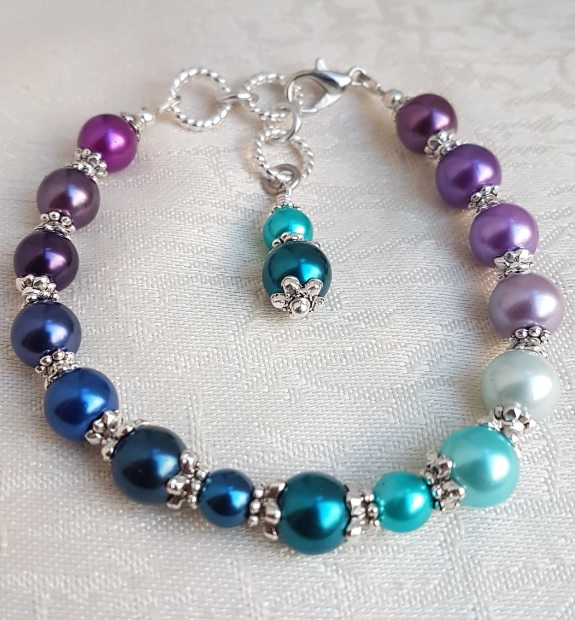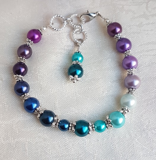 Gorgeous Spirit of the Peacock Beaded Bracelet. Fabulous Peacock colours of Purple, Blue Green and turquoise. Fantastic on its own or to wear with the Spirit of the Peacock Necklace or to match with any of the the Silver tone Earrings available in this collection. Lovely as a gift or as an everyday piece of colourful jewellery.