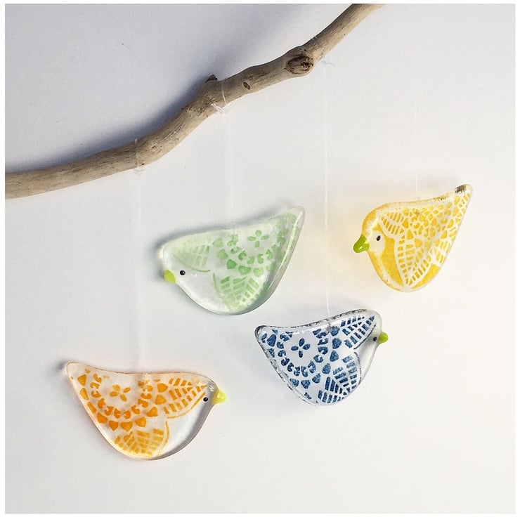 My birds are made in a specialised glass kiln where layers of glass are heated together to a temperature where the glass melts and fuses together. The design on my birds are fused in the glass and not painted on the surface.