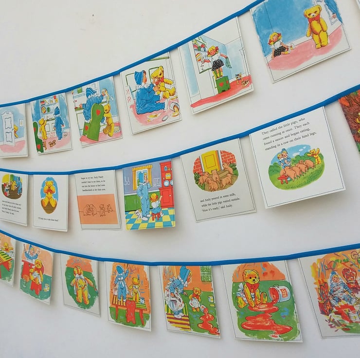 Listening to stories and looking at books was a huge part of my childhood and Andy Pandy books remind me of holidays at my Grandmother's house. By turning this much loved old book into bunting I have given new life to some wonderful illustrations.