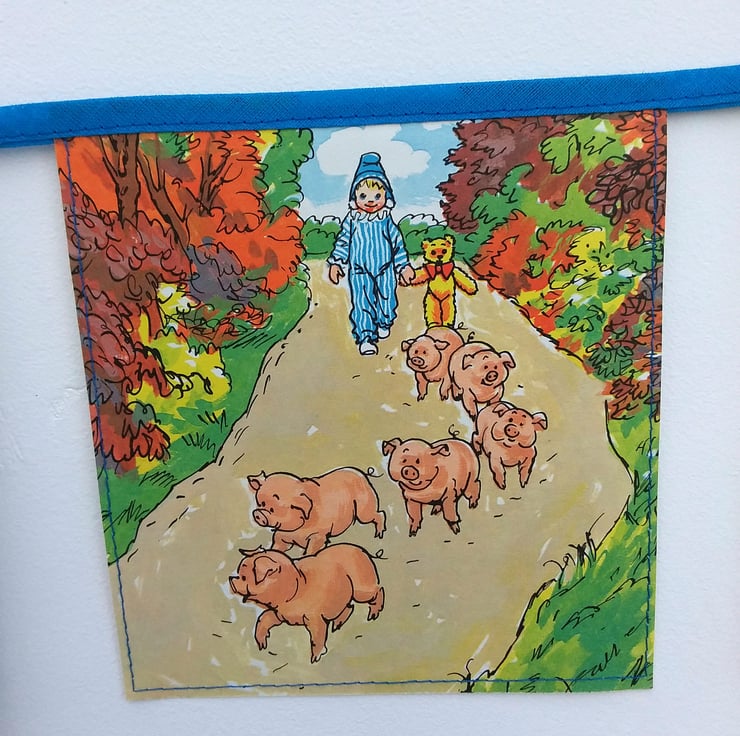 This is a length of bunting made from an entire Andy Pandy book - Andy Pandy and the baby pigs.