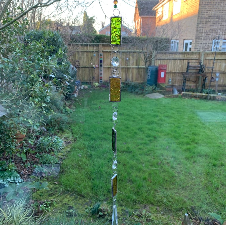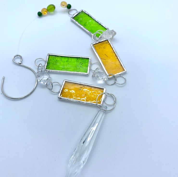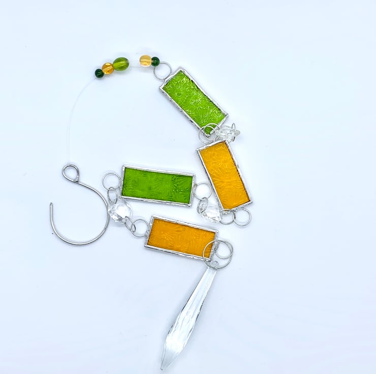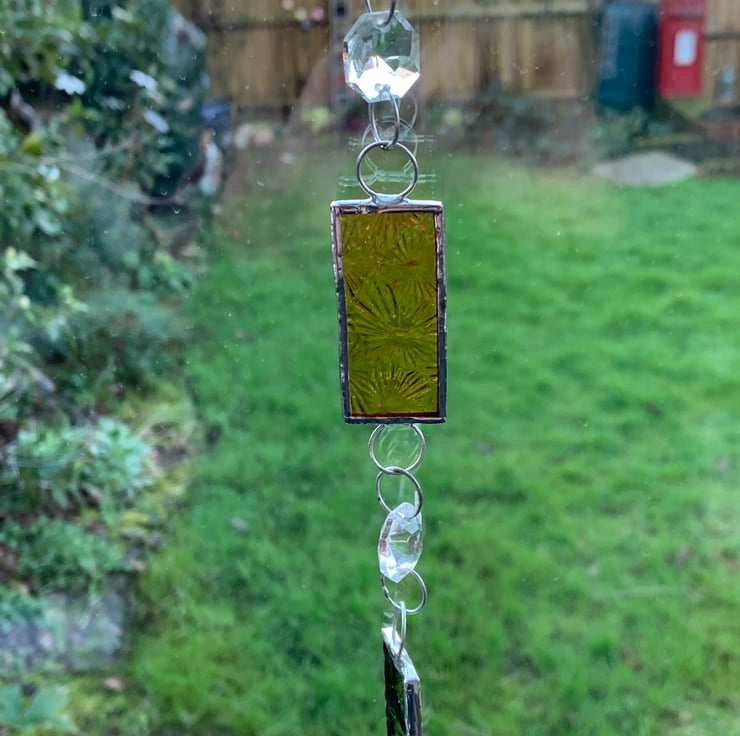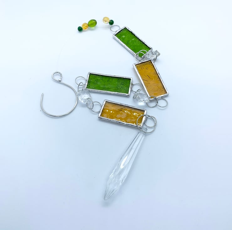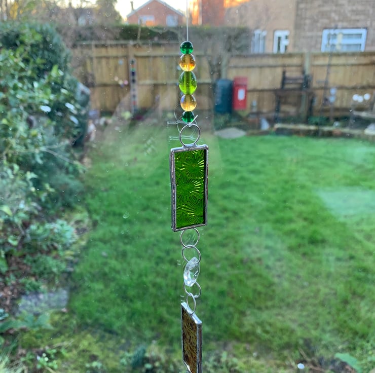 I’ve made this window Suncatcher / dangly thing for a better phrase. I’ve incorporated hexagonal and a crystal chandelier drop together with some lovely lime green and amber florentine glass so they will catch the light nicely.