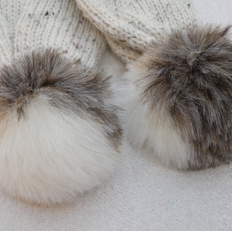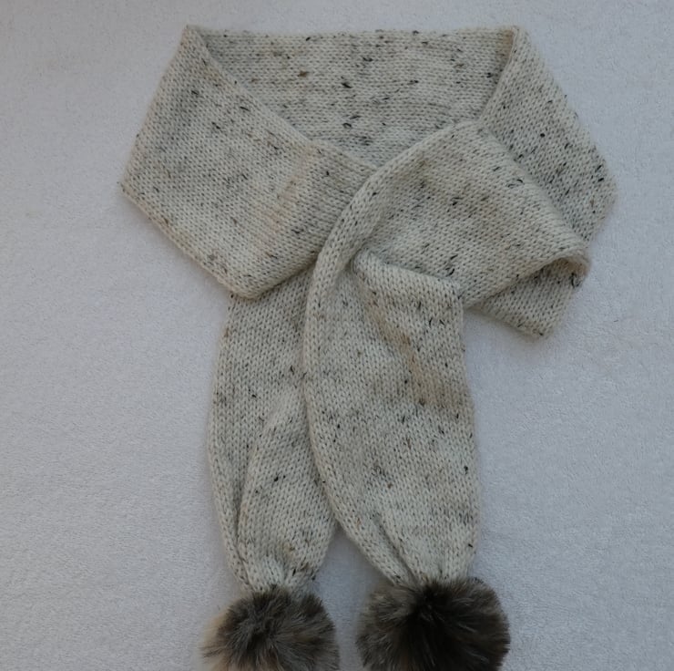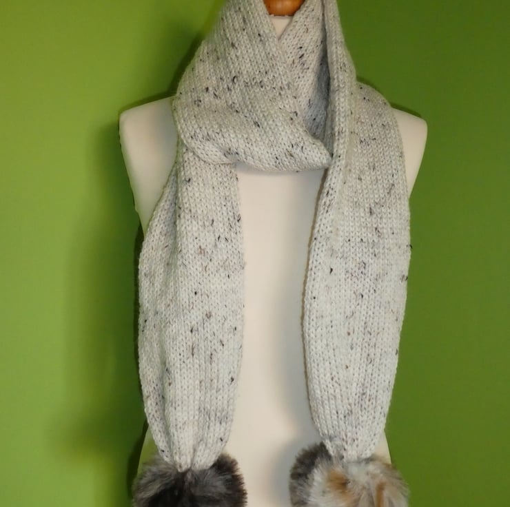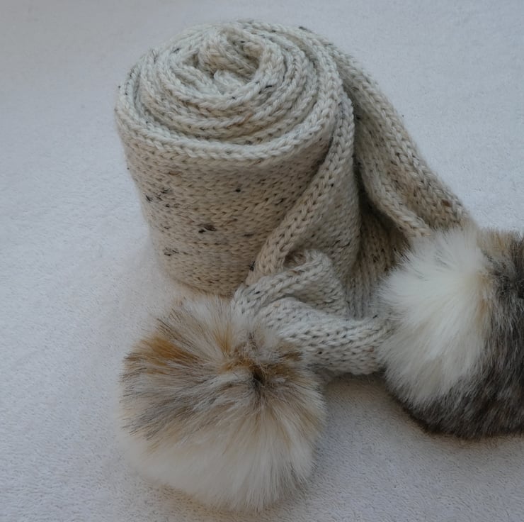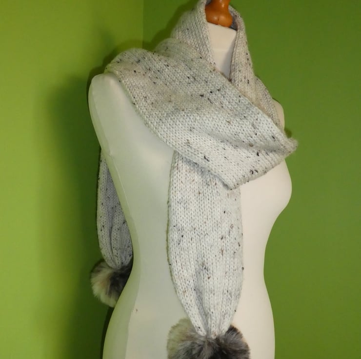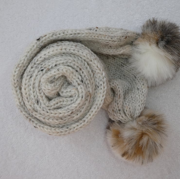 I have created this scarf from a beautifully soft blended alpaca and premium acrylic DK weight yarn. I then added a large handmade faux fur pom pom at each end.