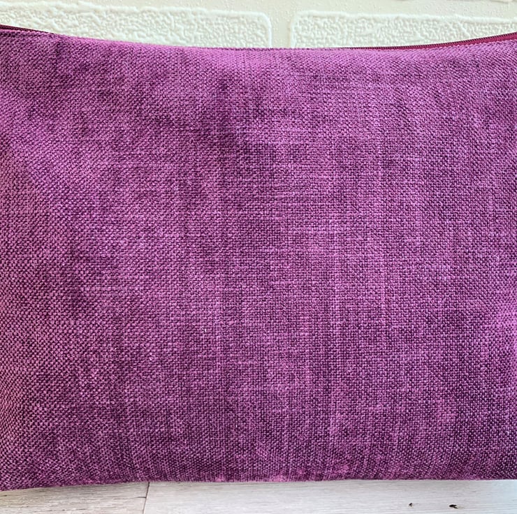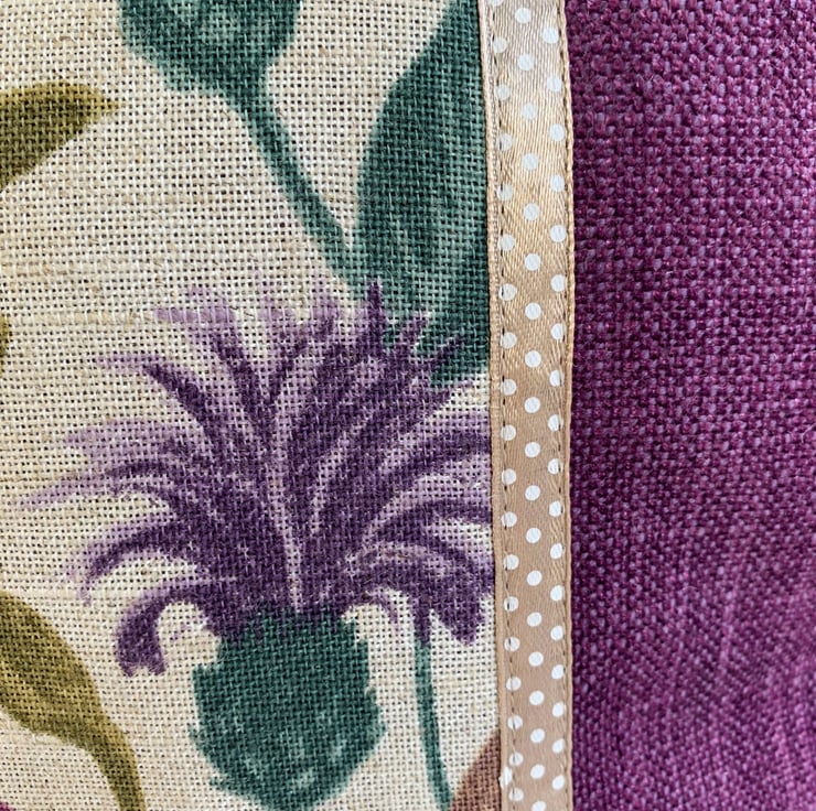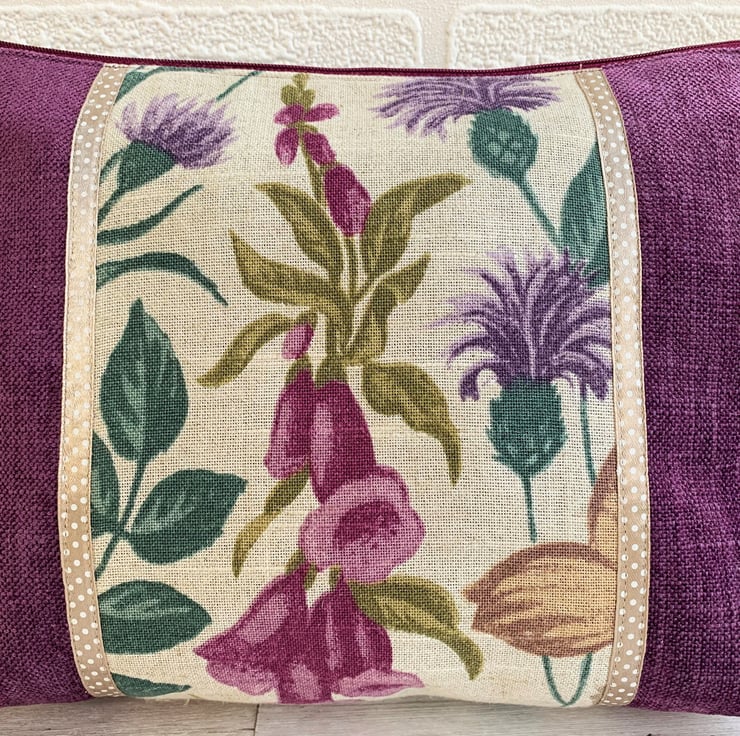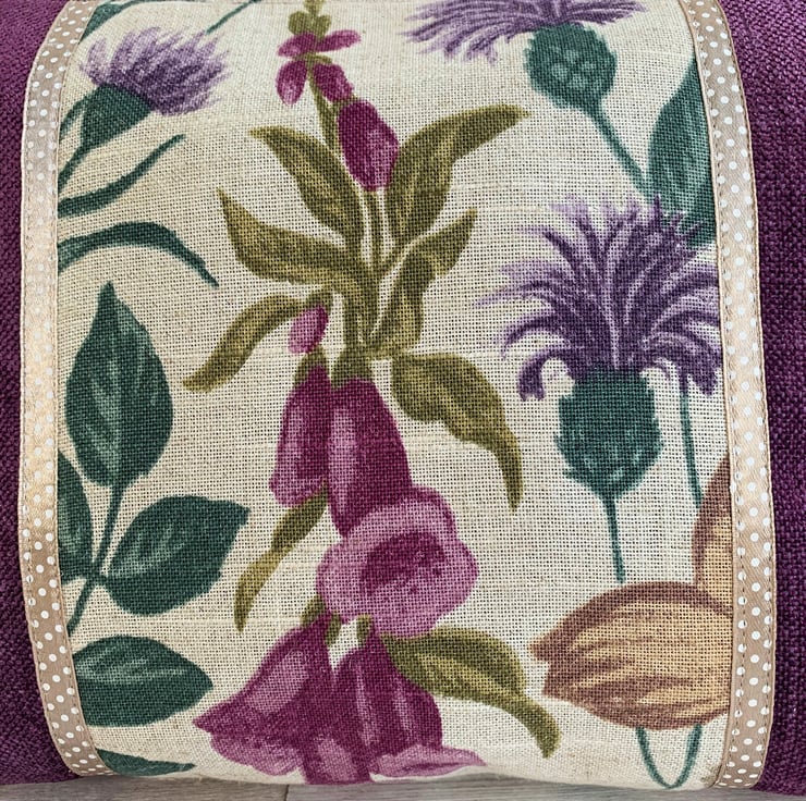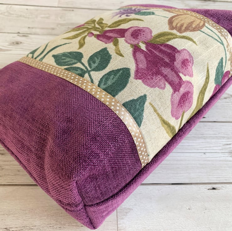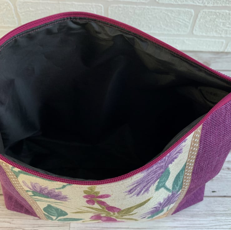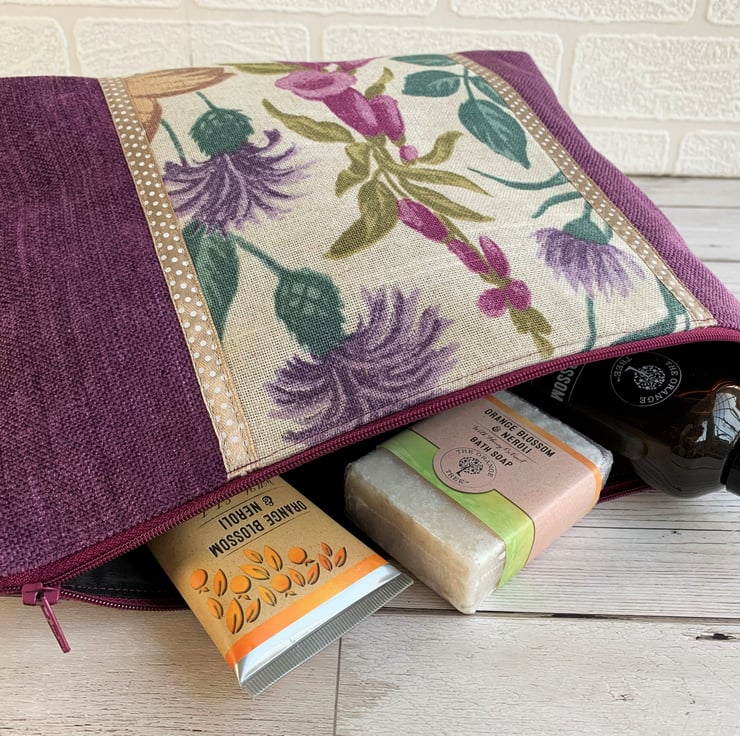 A purple toiletry bag with a front central decorative wildflower panel. The toiletry bag is made from sturdy purple fabric. The central panel is cream and features a pretty print pattern depicting thistles, clover and a foxglove. The panel is edged down both sides with beige satin ribbon with small white polka dots. The bag has a zipped opening with a purple zip and is fully lined with a black water-resistant lining. The base of the bag is boxed giving lots of space inside.