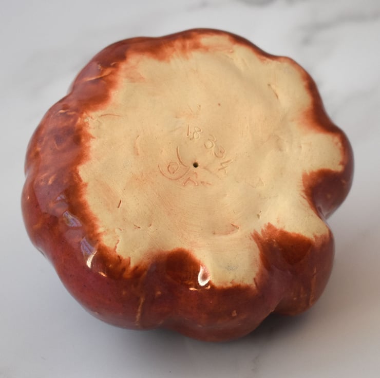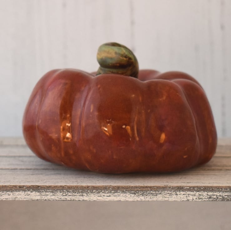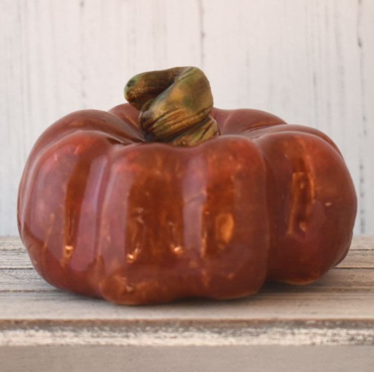 A decorative ceramic pumpkin with a brown/red glaze, around 11.5cm wide and 7.5cm high. This pumpkin is an early attempt and is quite heavy for it's size.