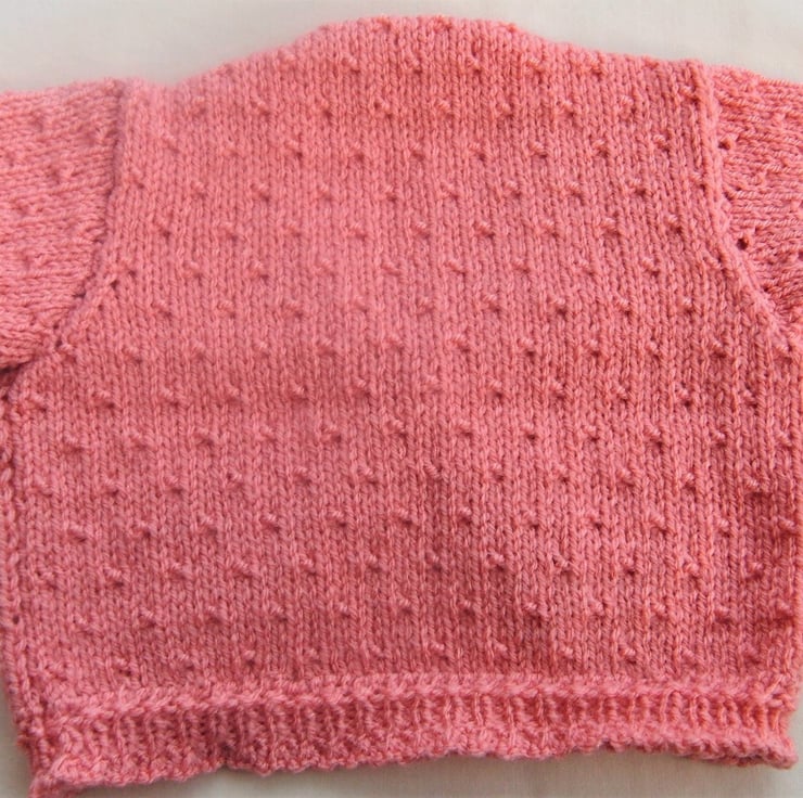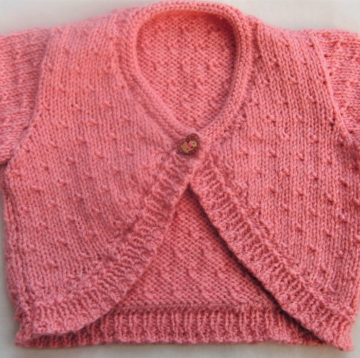 The short sleeved pink cardigan is not currently in stock but it can be made for you in a size and colour of your choice.