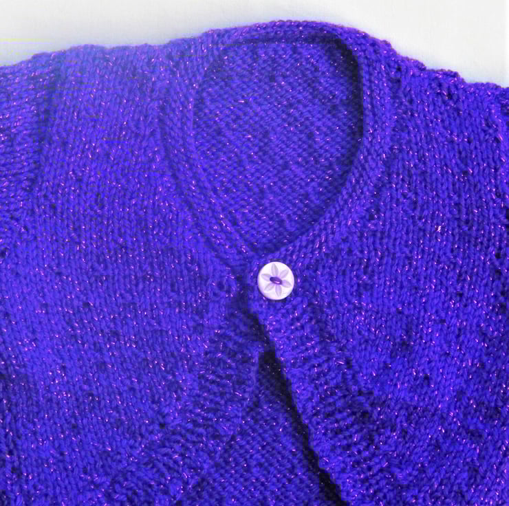Beautiful curved front cardigan for a baby girl hand knitted in double knitting wool. The baby cardigan has an attractive curved front border ending in a one button fastening. It can also be knitted with short sleeves as shown in the attached photos.
