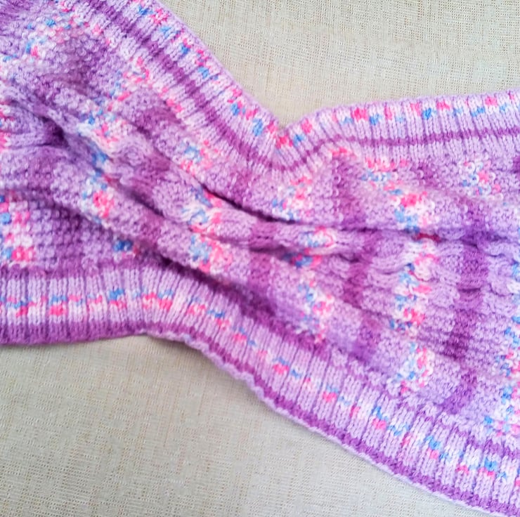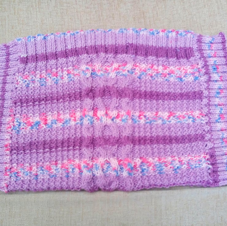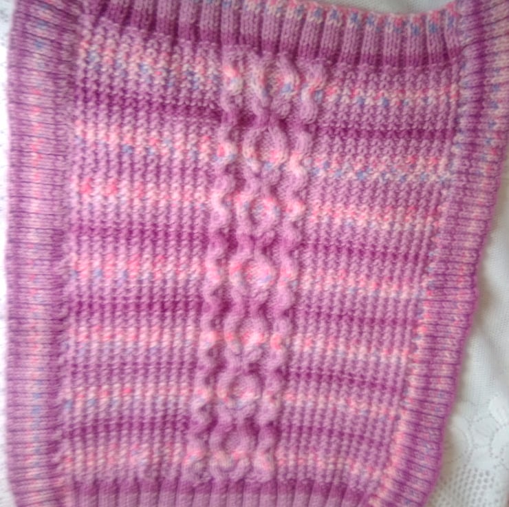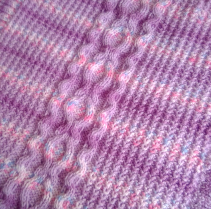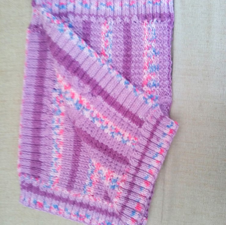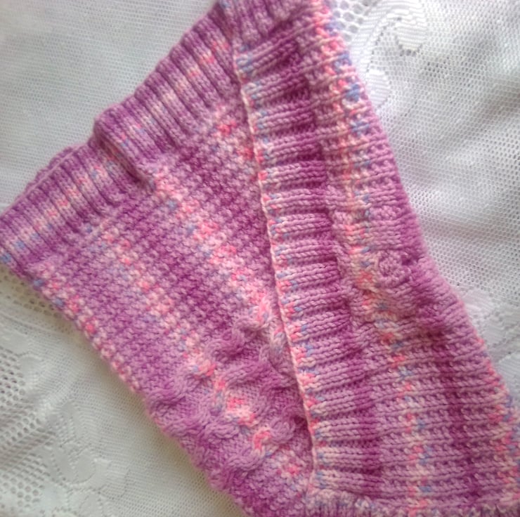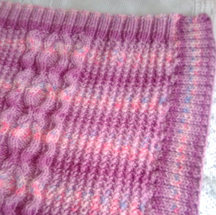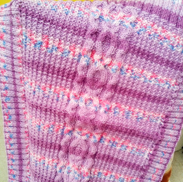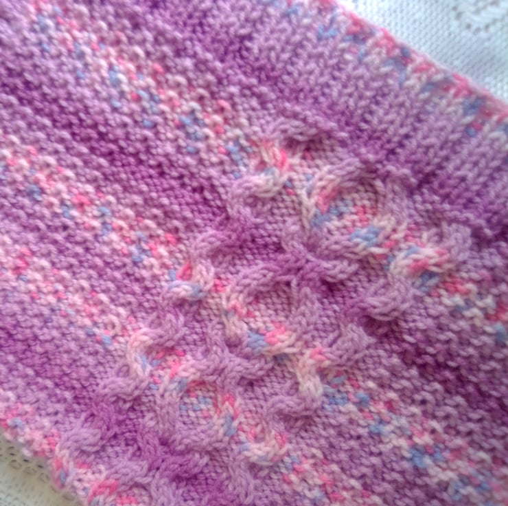 Very pretty but practical cable patterned baby's pram blanket. It is hand knitted in aran yarn in the pink/purple colour shown so is very warm and cosy for the chilliest days. The overall measurements of the blanket are 25.5 inches (65 cm) x 23 inches (58.5 cm).