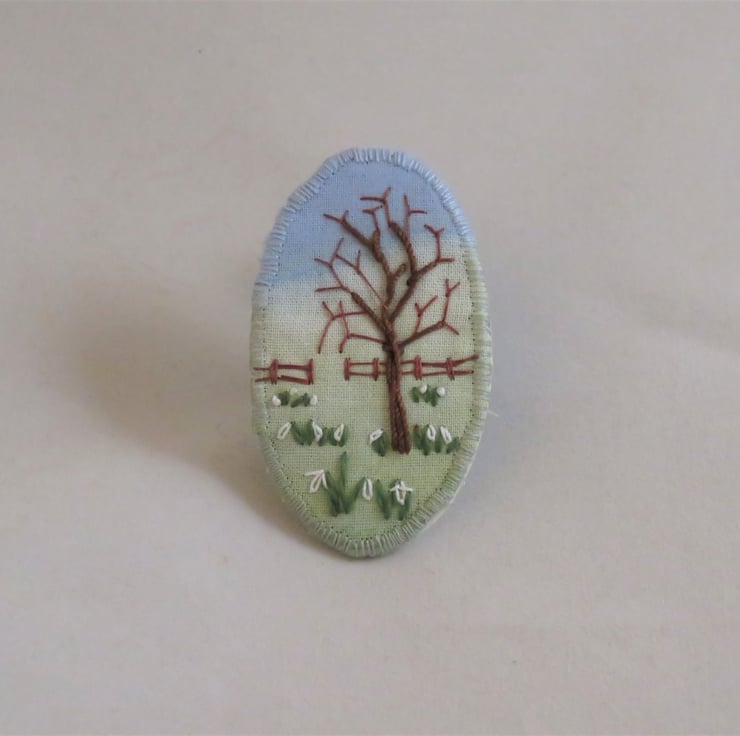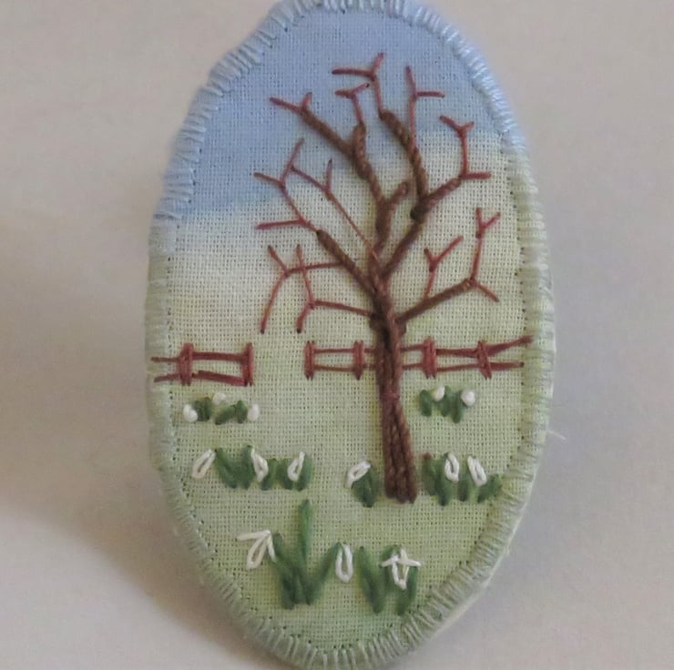A pretty winter landscape featuring snowdrops and a winter tree embroidered on a hand painted background.