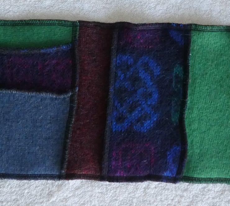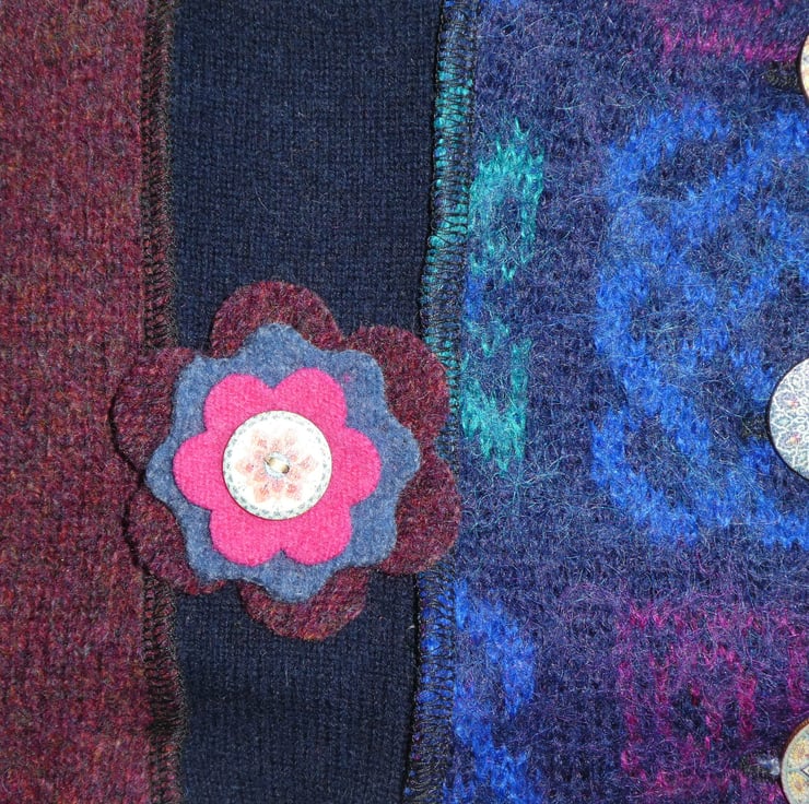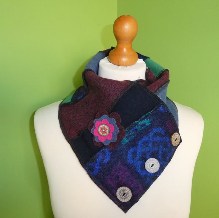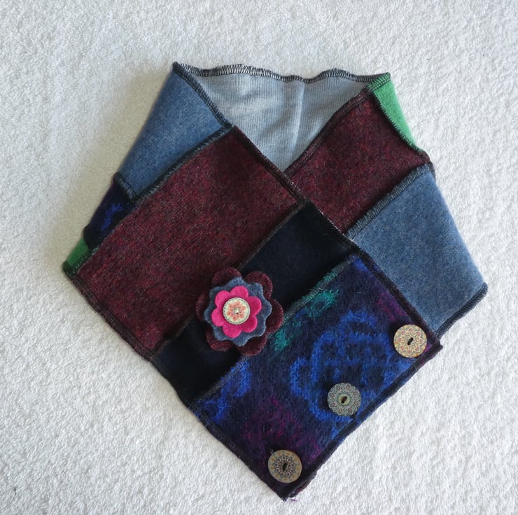 I have designed and created this fantastic cowl to keep you warm and snug. It is made from previously loved and recycled jumpers, that I have washed in a hot temperature and pre-shrunk. I have then cut and re-stitched the jumpers, into a patchwork strip with all seams being professionally finished with a serger/over-locker. Interfacing has been applied behind the buttonholes for stability, before a backing has been stitched in place. 3 wooden buttons have been sewn on to fasten this cowl. A decorative felt flower with button center has been pinned to the cowl with a safety locking clasp, so is removable.
