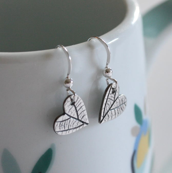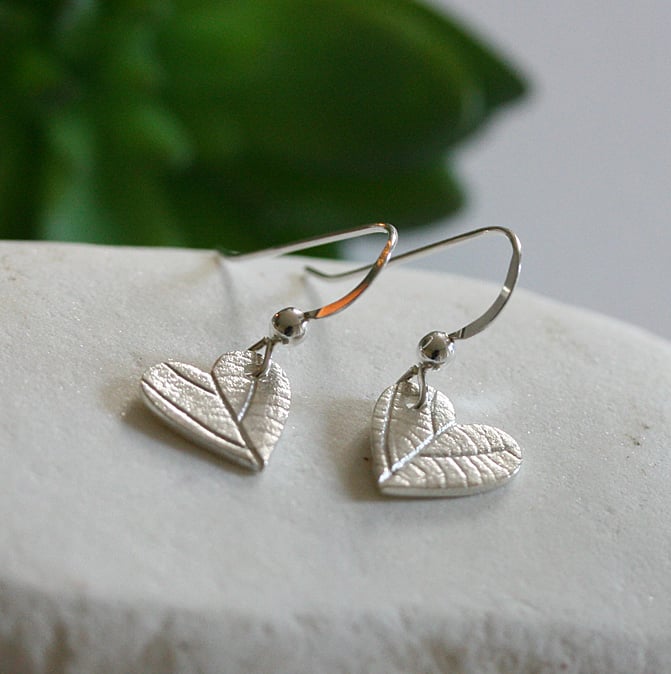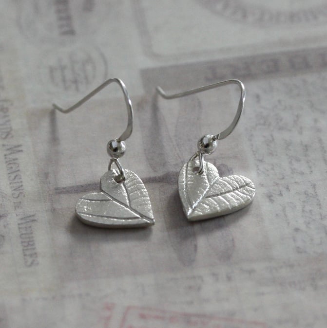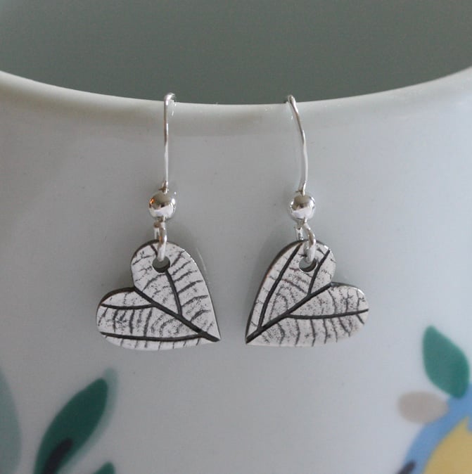 Lovely dainty fine silver heart shaped earrings with a beautiful leaf print set on sterling silver ear wires. Please note as I always take the print from a real leaf the print may vary slightly from the pictures shown.