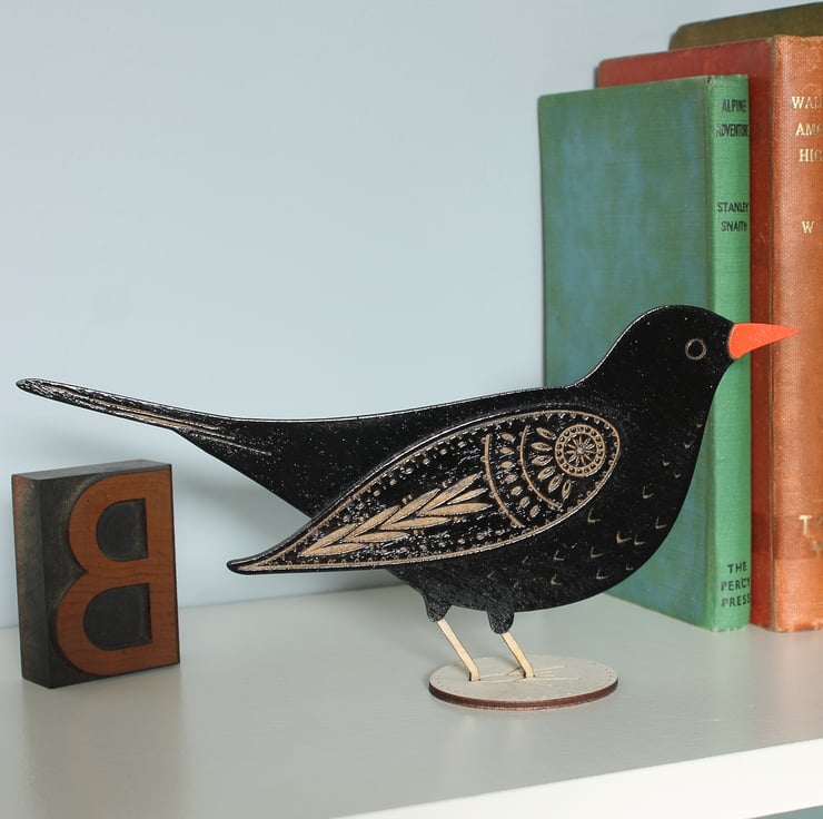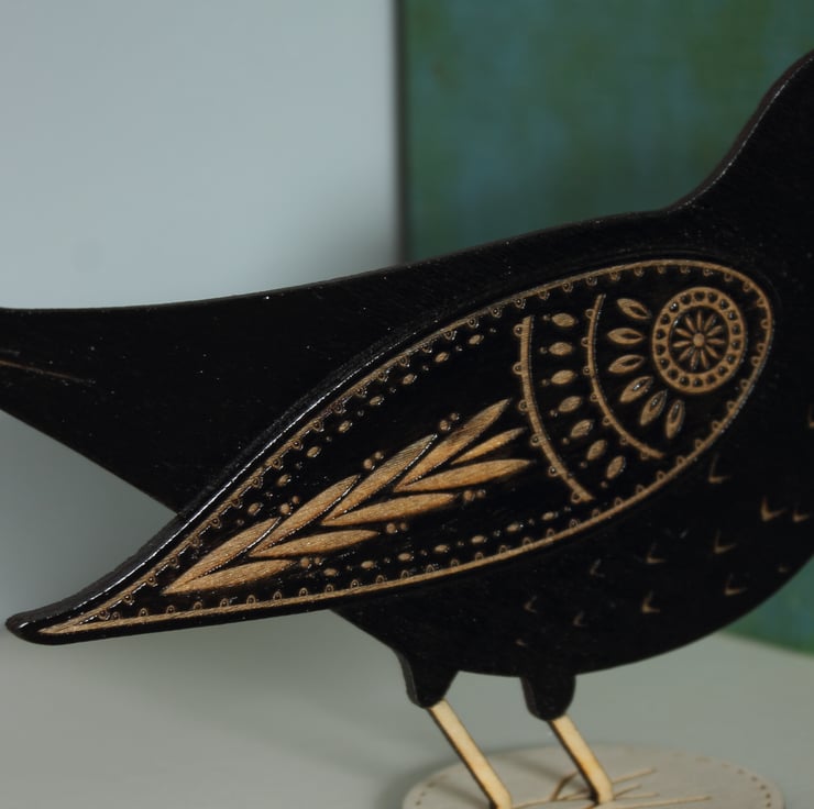 Cut from 3mm ply, he’s hand painted in black paint, and has etched detail on his body and tail, as well as a pretty floral pattern adorning his wing. He also sports the classic bright orange beak of the blackbird. . He also features a pretty leaf pattern etched onto his wing, with white detail. He’s finished with a glossy varnish to keep him looking lovely.