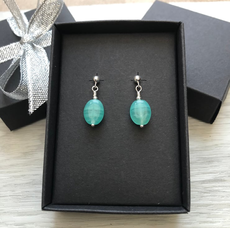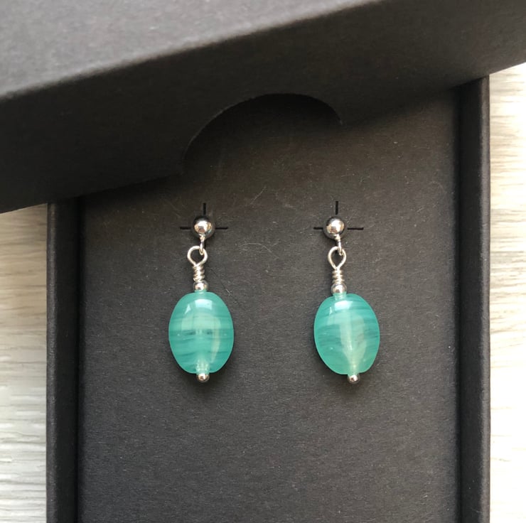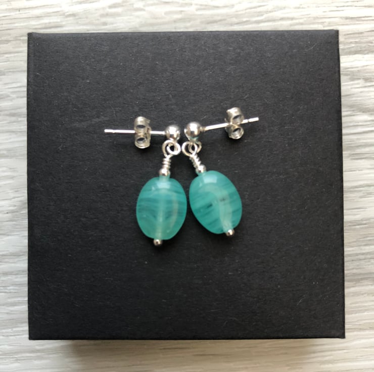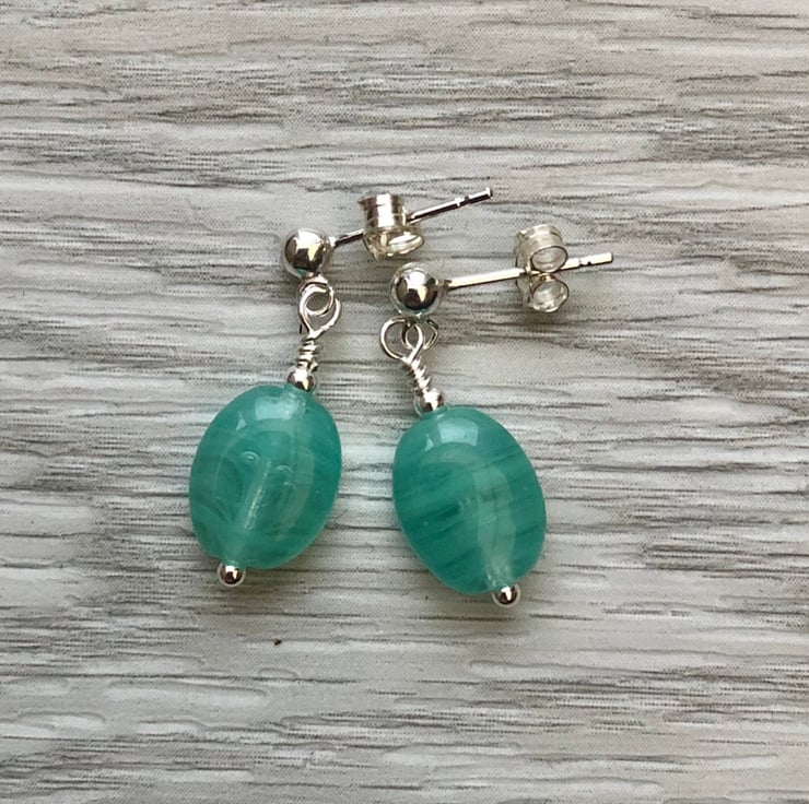 Made using blue/green Czech glass beads which measure 7x9mm. Hand wired into a sterling silver head pin with a sterling silver bead. The hang from sterling silver post earrings which fasten with butterfly backs.