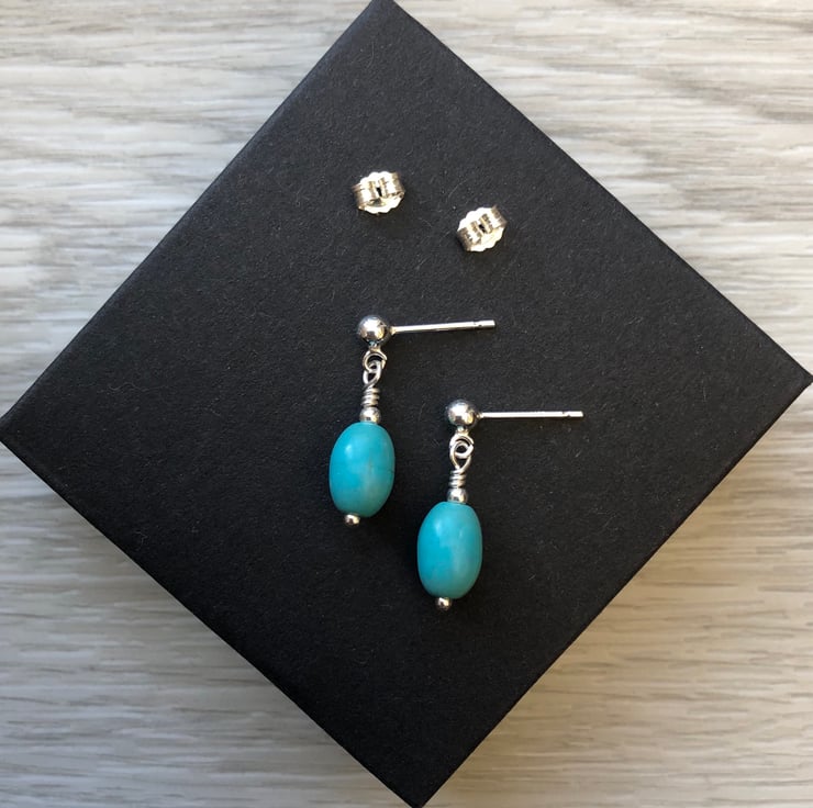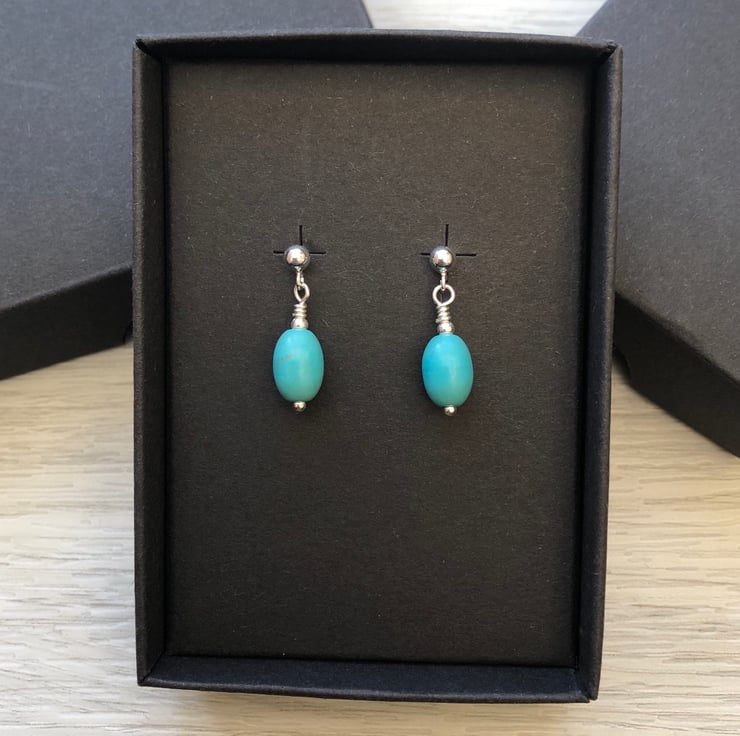 Made using semi precious turquoise oval beads which measure 10mm. Hand wired onto a sterling silver head pin with a sterling silver bead. The hang from sterling silver post earrings which fasten with butterfly backs.