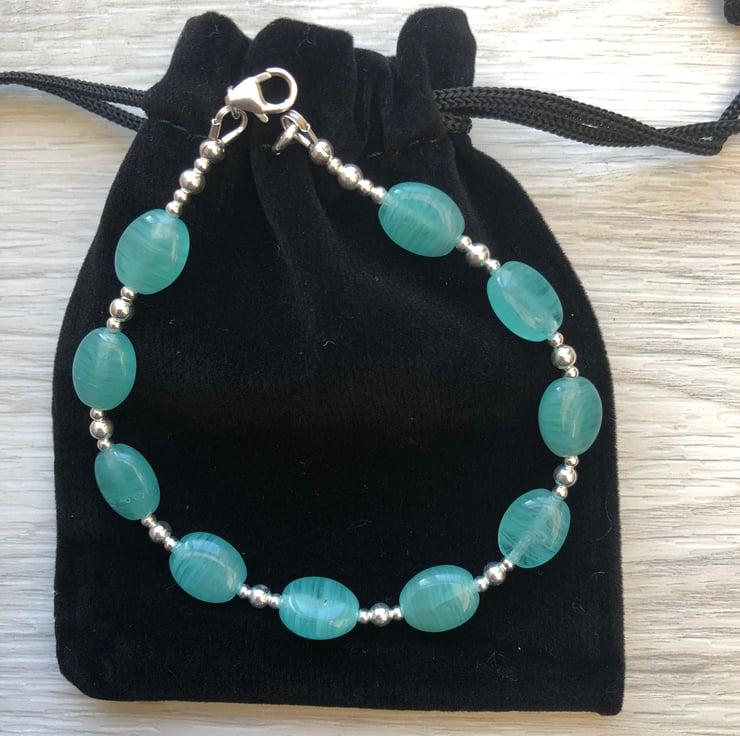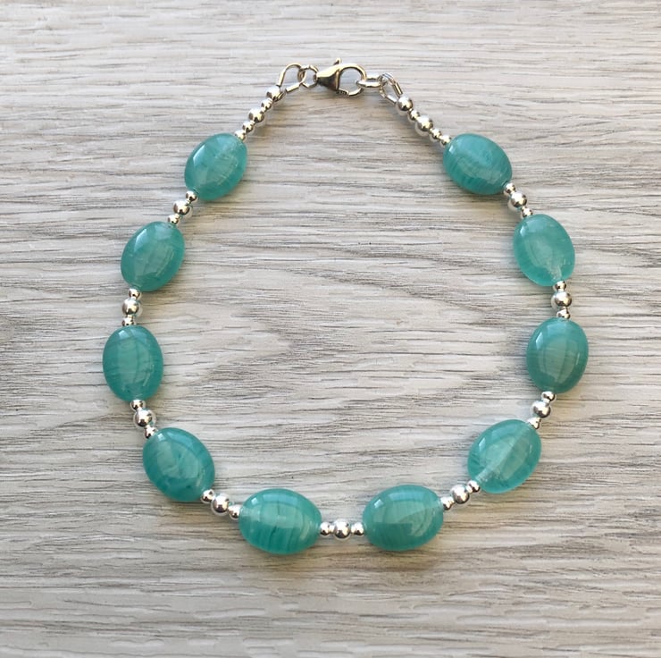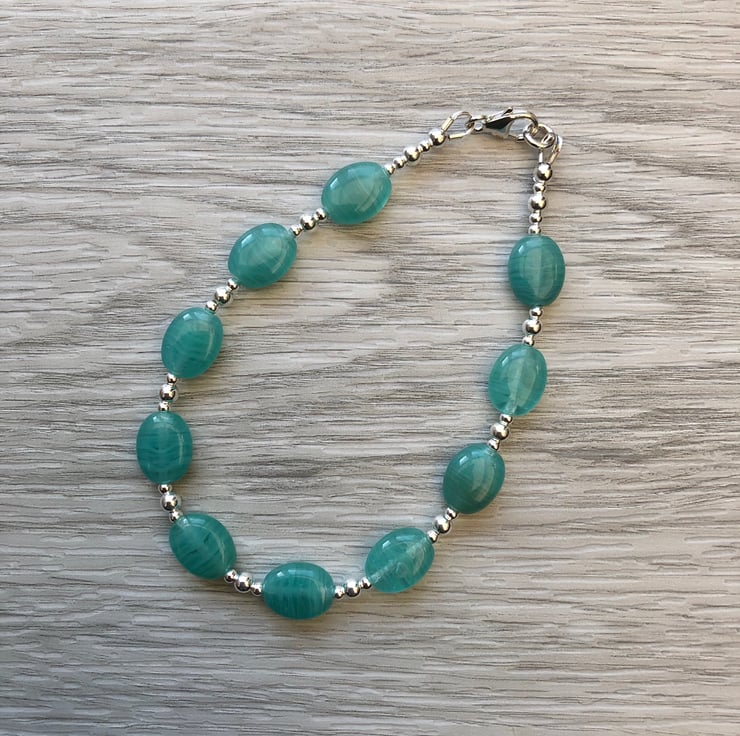 Made using blue/green Czech glass beads which measure 7x9mm. Hand wired onto strong tiger tail beading wire with 2 & 3 mm sterling silver beads. Fastens with a sterling silver lobster clasp.