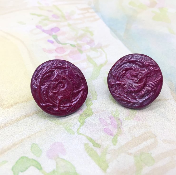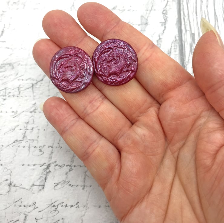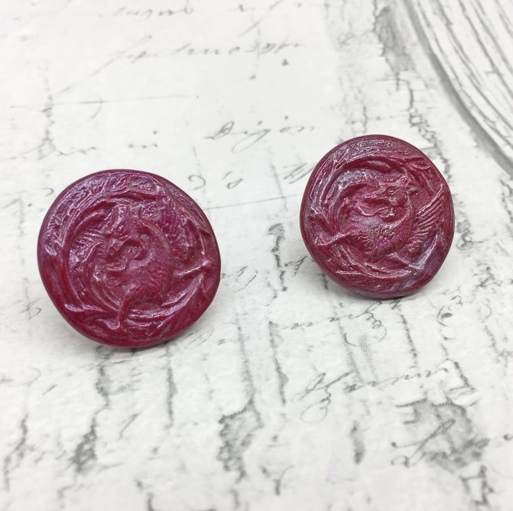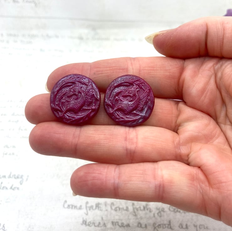 I'm a bit obsessed with UTEE/Embossing Enamel at the moment and am fascinated by how you can put it in moulds! So I thought I would make some silicone moulds of a few of my buttons and see how they came out! WOW! The detail is more amazing than I thought they would be! If you're a fan of vintage buttons, Medieval animals, Illuminated Manuscripts or Mythology - these earrings are perfect for you!