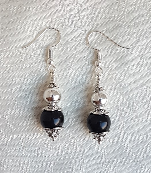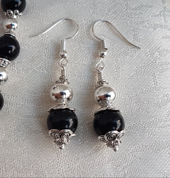 Gorgeous handmade jewellery. Fabulous Black Obsidian beads and shiny Silver plated beads are stunning together in this piece of jewellery. A lovely clash of darkness and light makes a striking pair of earrings. A great gift or a treat for youself.