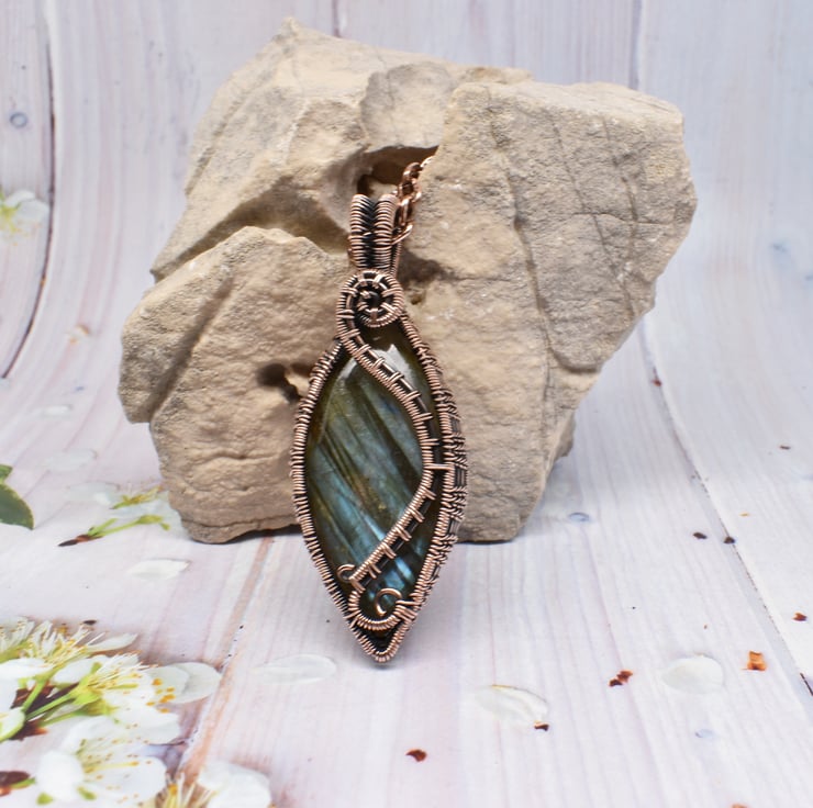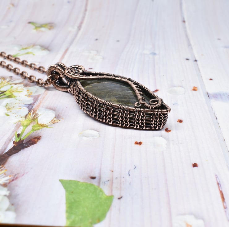 I have woven around this lovely stone using solid copper wire, given it a patina to age the copper, then hand polished it to an antique copper finish.
