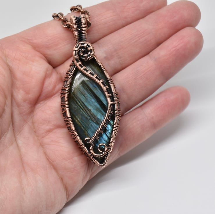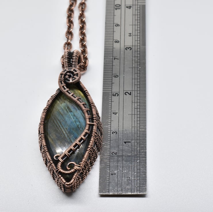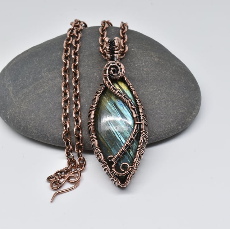 It hangs from an 18 inch copper chain with a handmade clasp I have oxidised and polished to match.