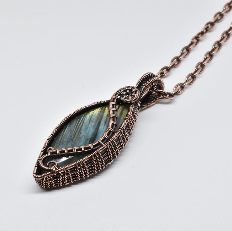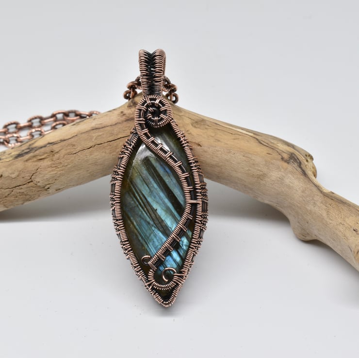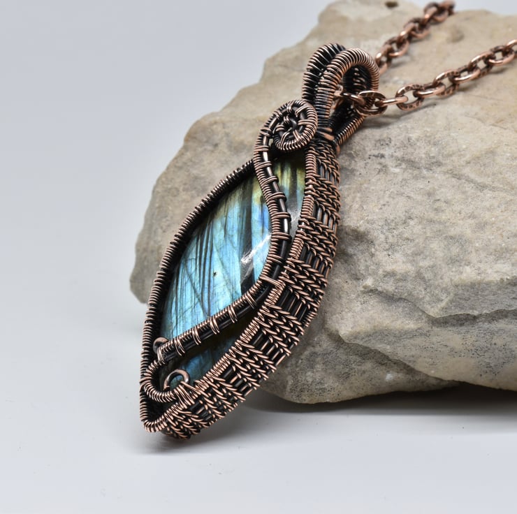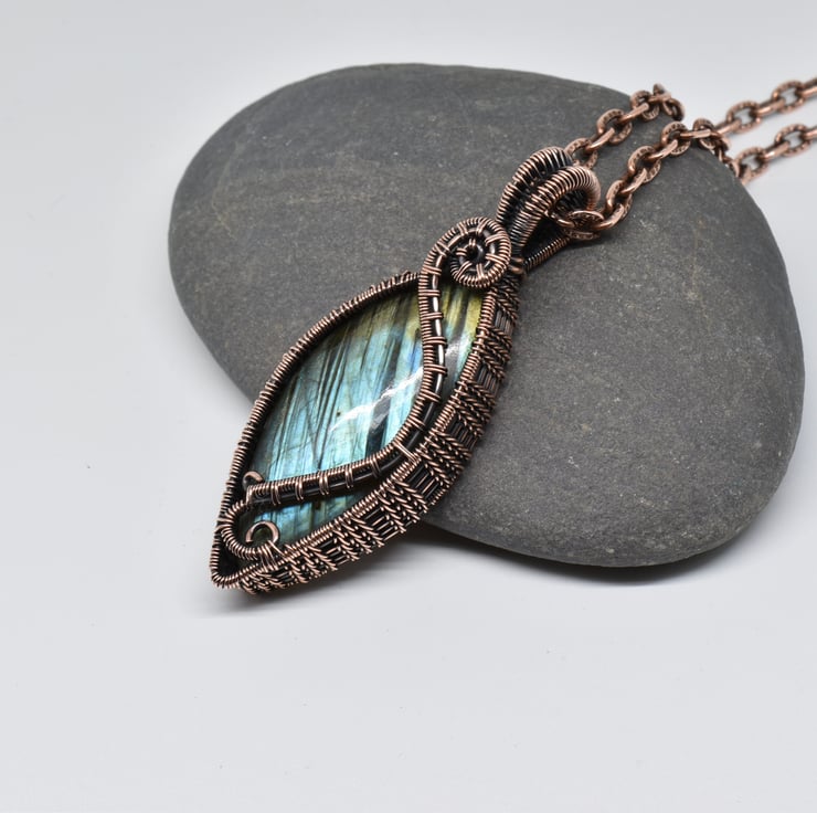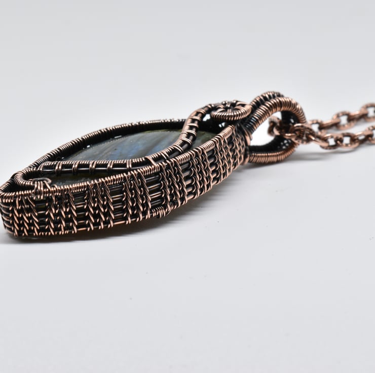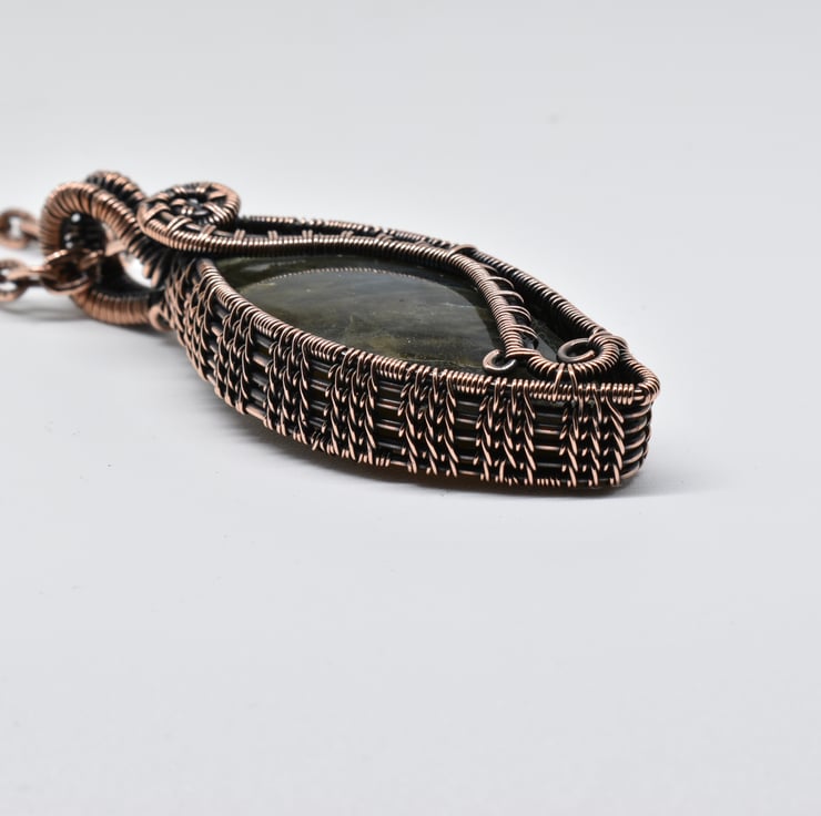 I have woven around this lovely stone using solid copper wire, given it a patina to age the copper, then hand polished it to an antique copper finish.