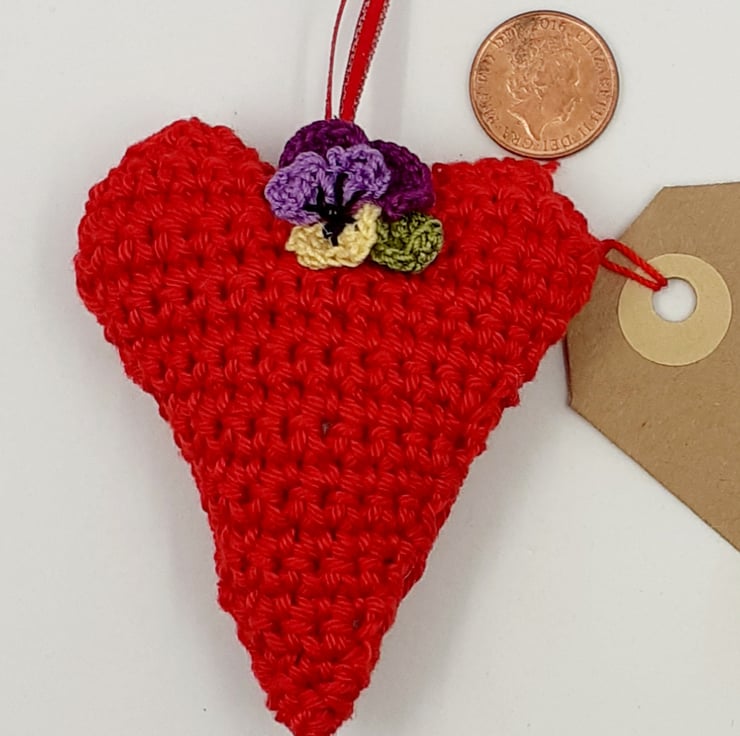 This romantic heart with message attached would make a lovely keepsake alternative to a greetings card. It is crocheted in cotton and filled with polyester stuffing. The heart is embellished with a tiny crocheted viola flower and leaf, traditionally symbolising loving thoughts. The tag reads, ' With all my love' although I am very happy to exchange this tag for one with wording of your choice.