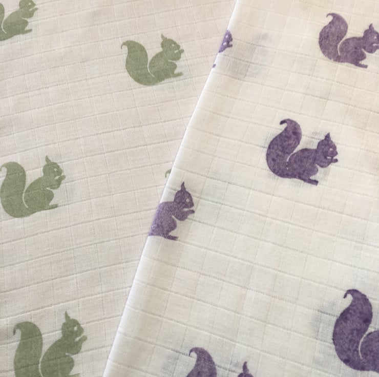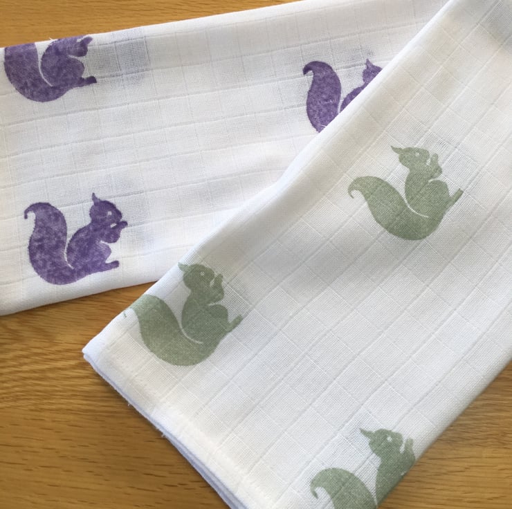 Hand block printed baby muslin squares measuring 70cm by 70cm with a squirrel design. Come in a pack of two.