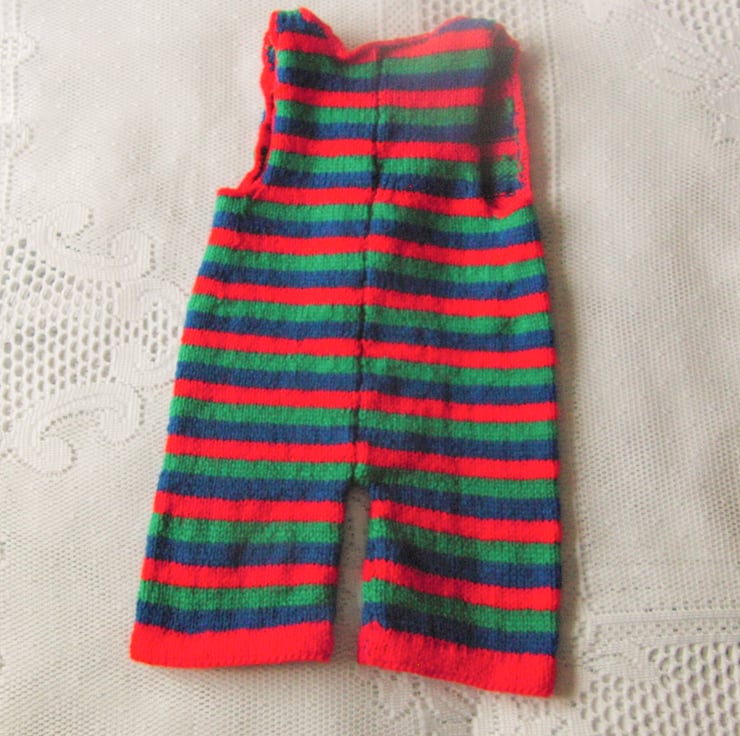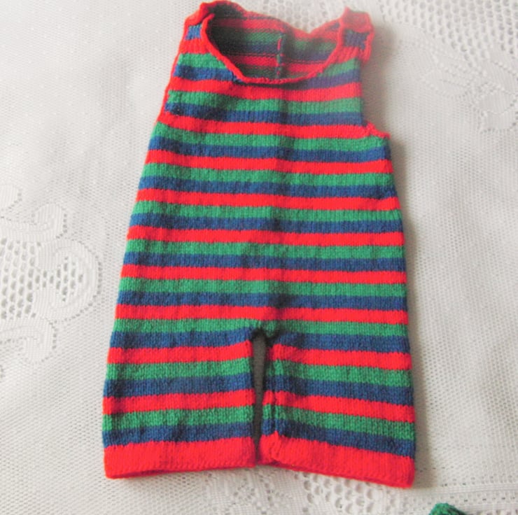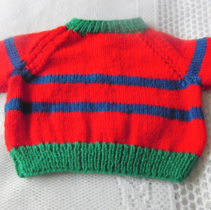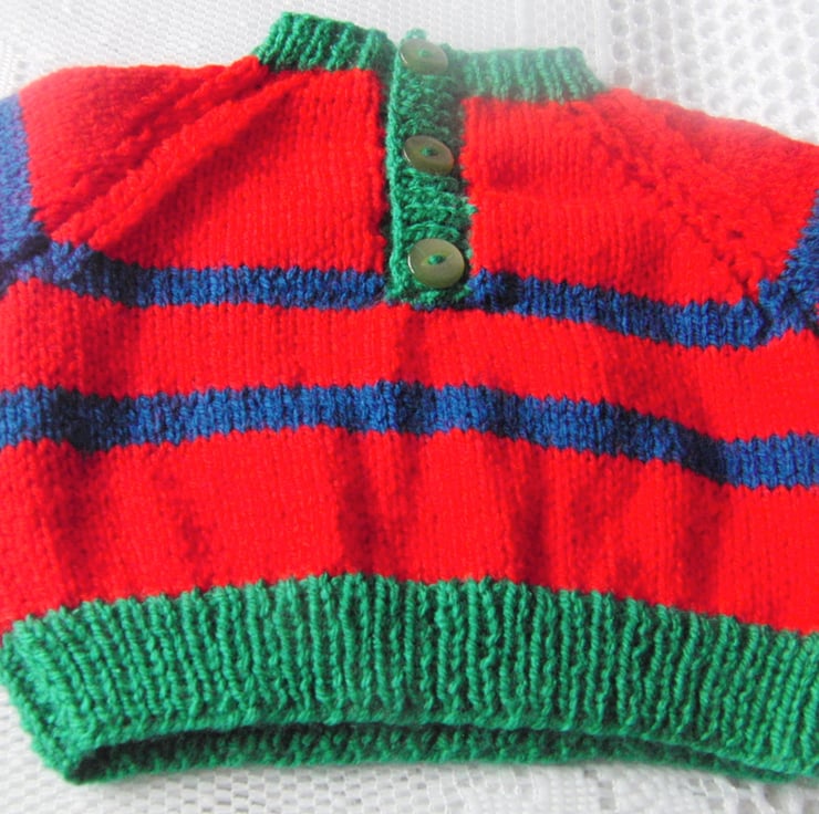 A practical baby's dungarees and jumper set is hand knitted in blue, red and green double knitting weight yarn. It would make an ideal gift for a new baby or a baby shower or a lovely treat for your own little one.