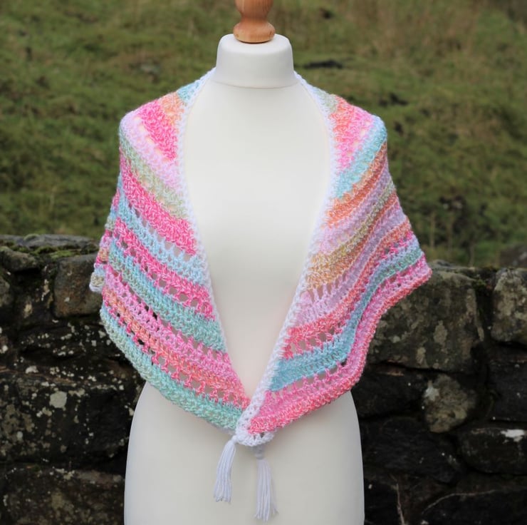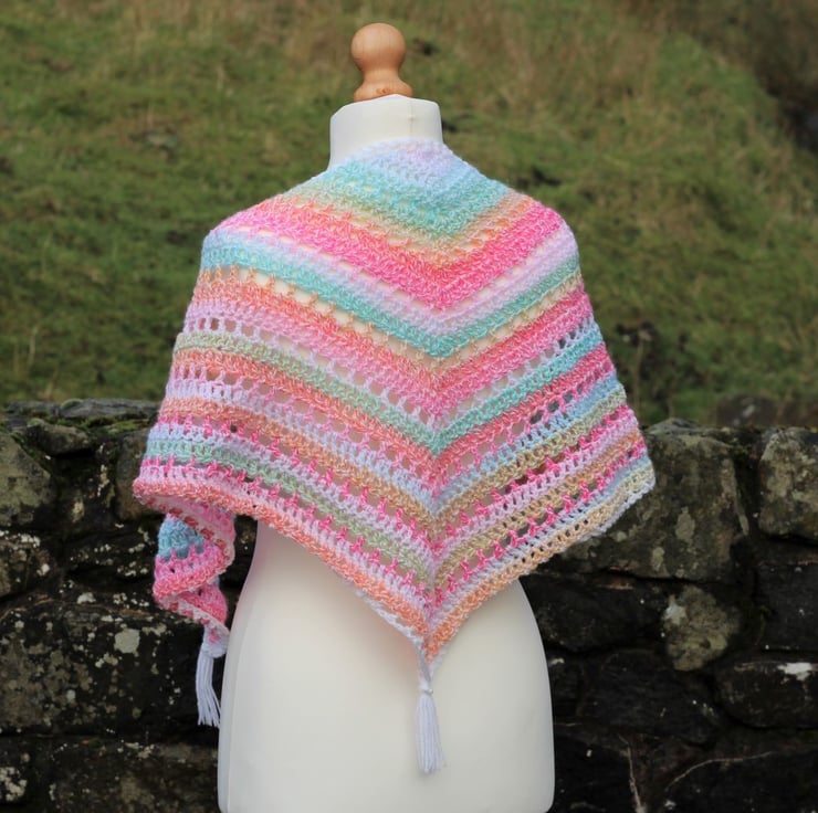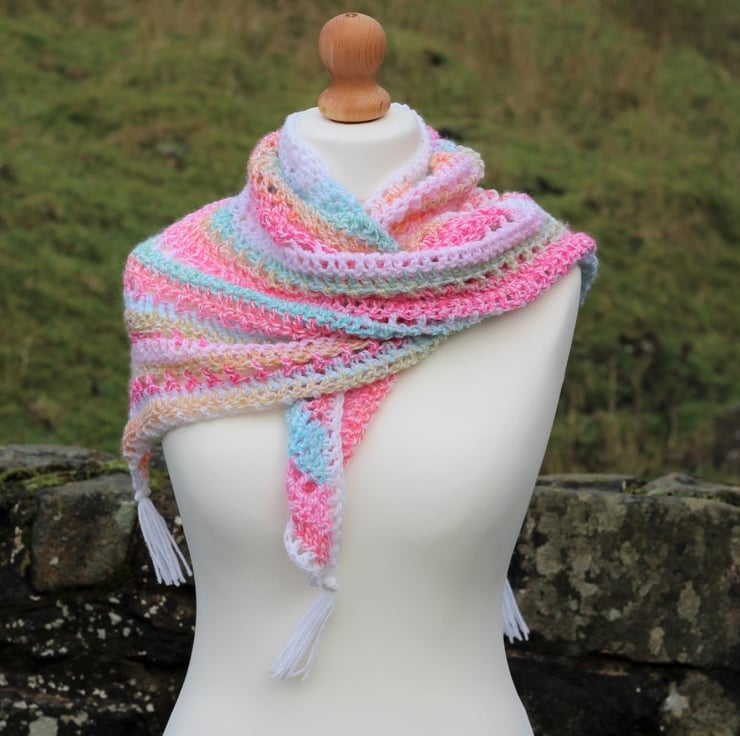 The colours of a cottage garden in spring are what I think of when I look at this hand crocheted triangle scarf.