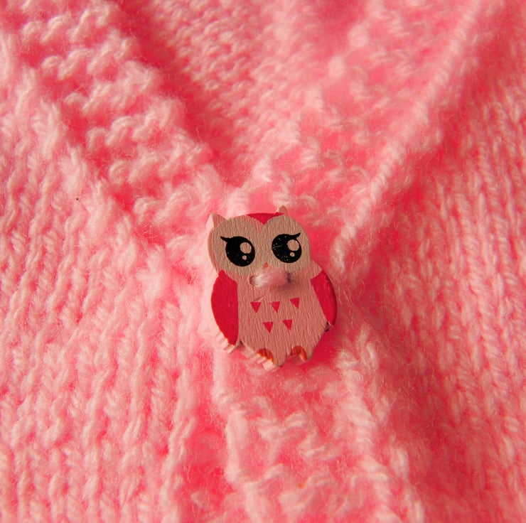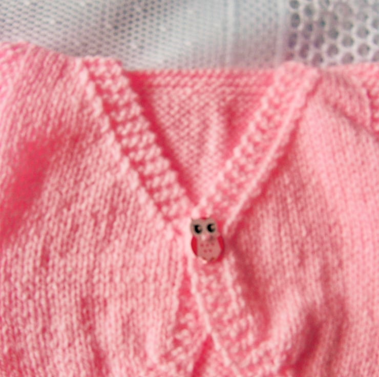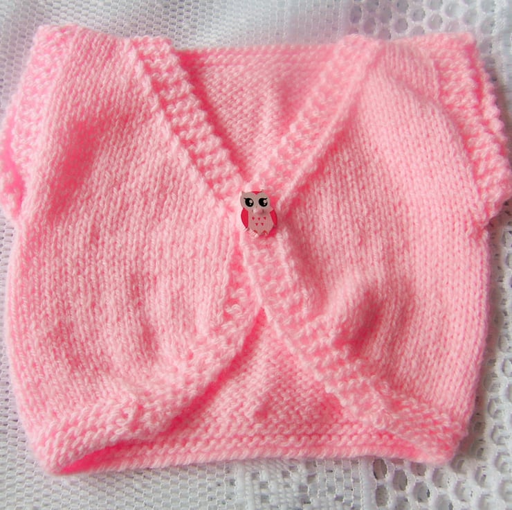 Simple and classic curved front sleeveless cardigan for a baby girl hand knitted in double knitting yarn The baby cardigan has an attractive curved front ending in a cute pink owl wooden button fastening. It would make an ideal baby shower gift, new baby gift or a treat for your own little one.