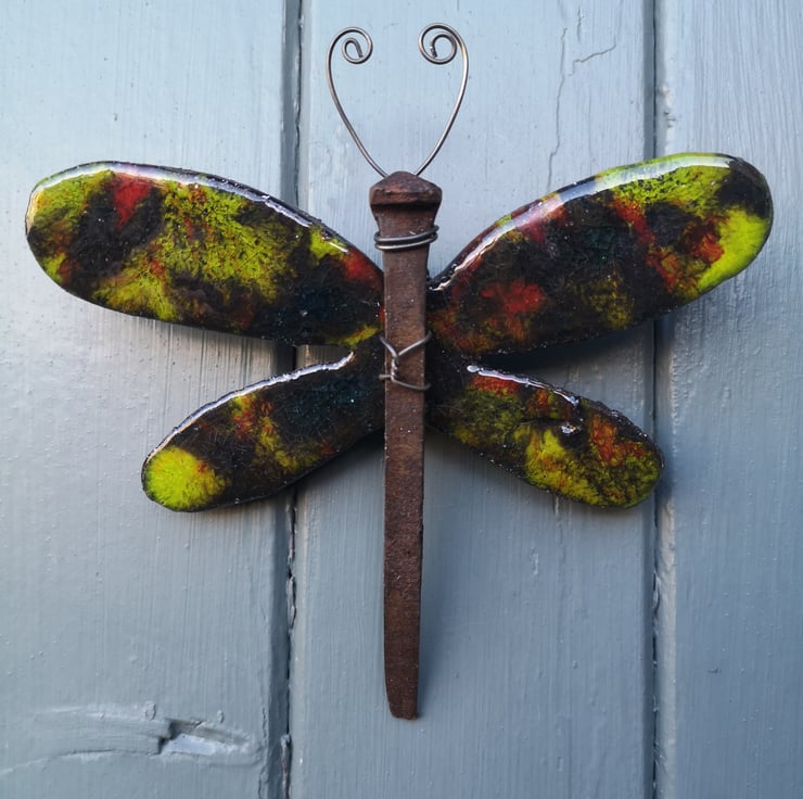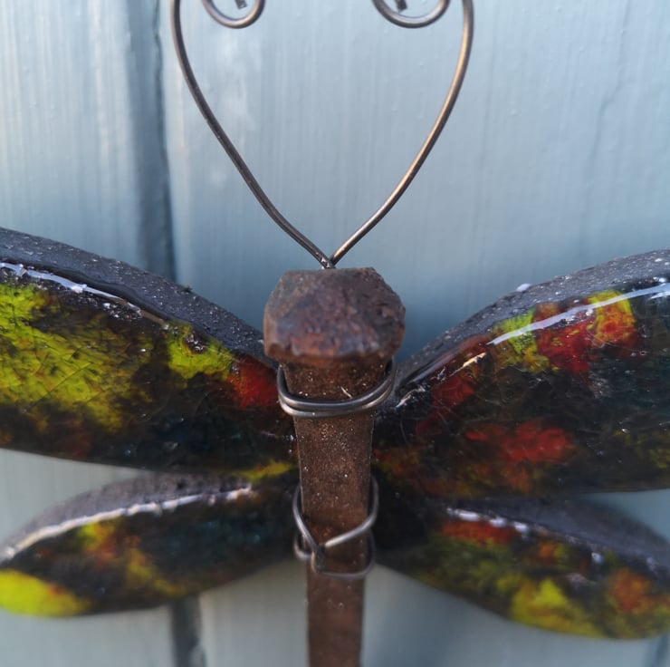 Every Dragonfly and Butterfly is unique, the body of the insect is a reclaimed rusty nail !