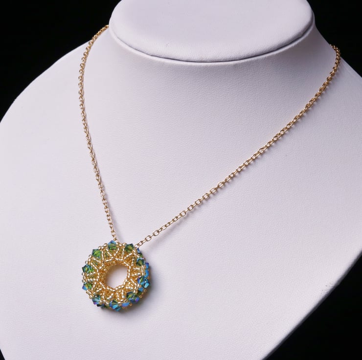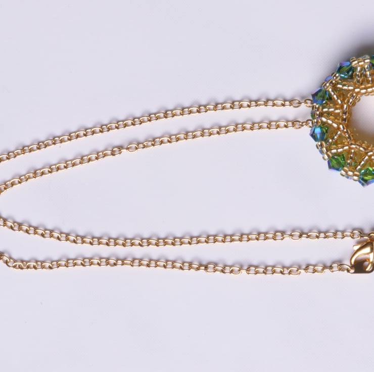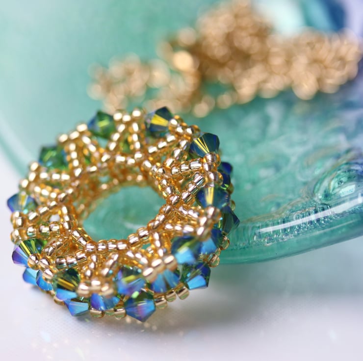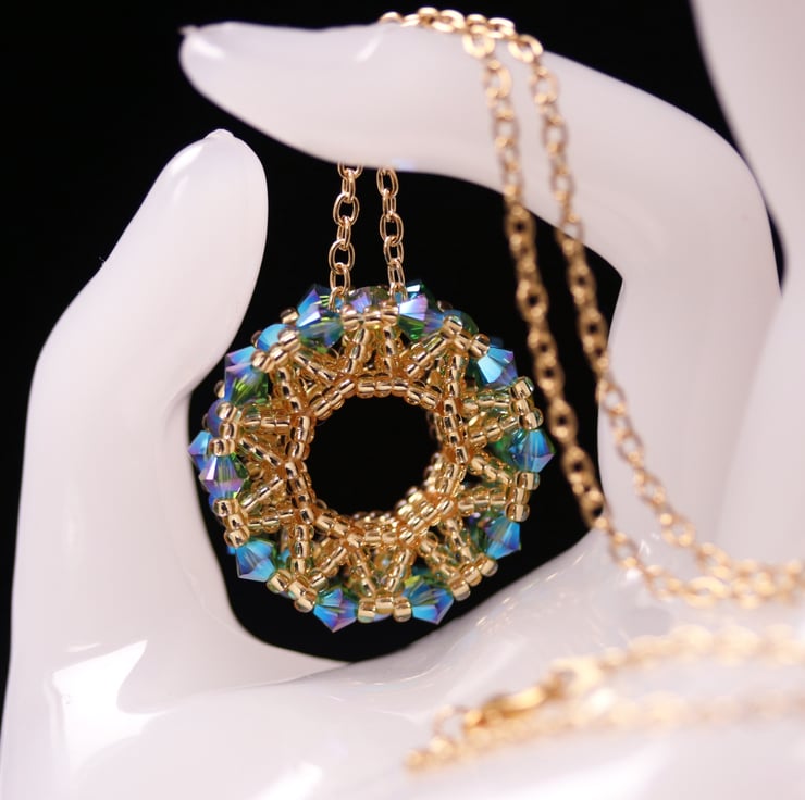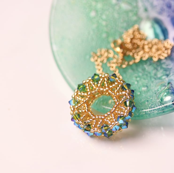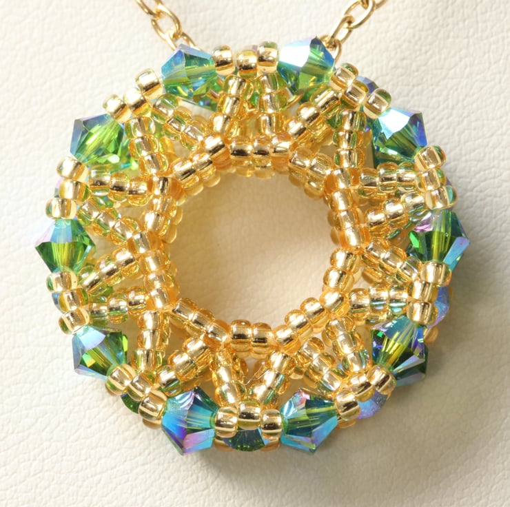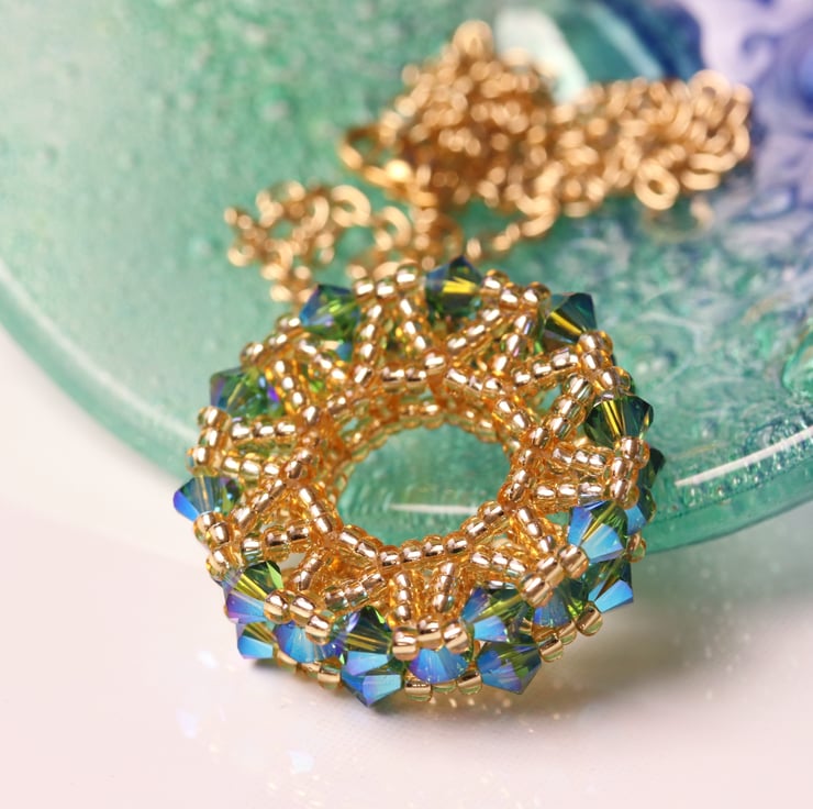 This little beadwoven pendant is only 3cms in diameter and is double sided, so that the back and front are the same. It has glittery 2AB fern green Swarovski crystals around its edge and little silver-lined gold seed beads complete the piece. The 2AB effect on the crystals is a thin metallic coating on the facets that reflects the light and gives a mirror-like effect.