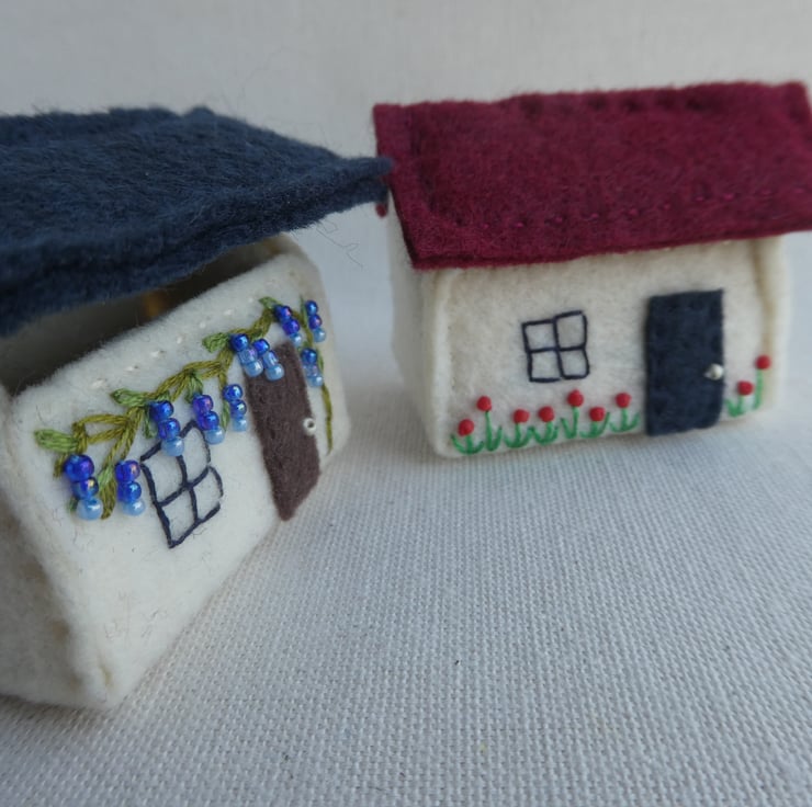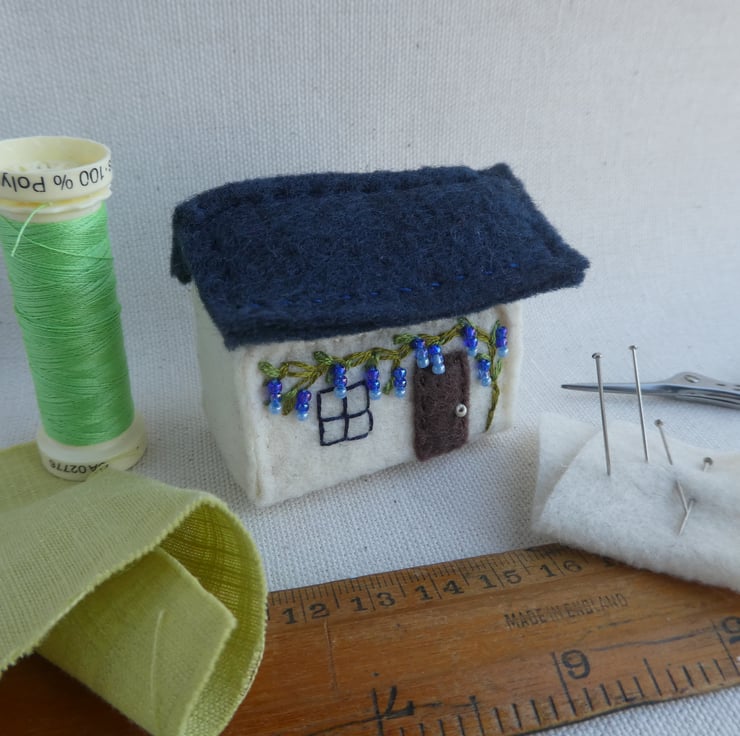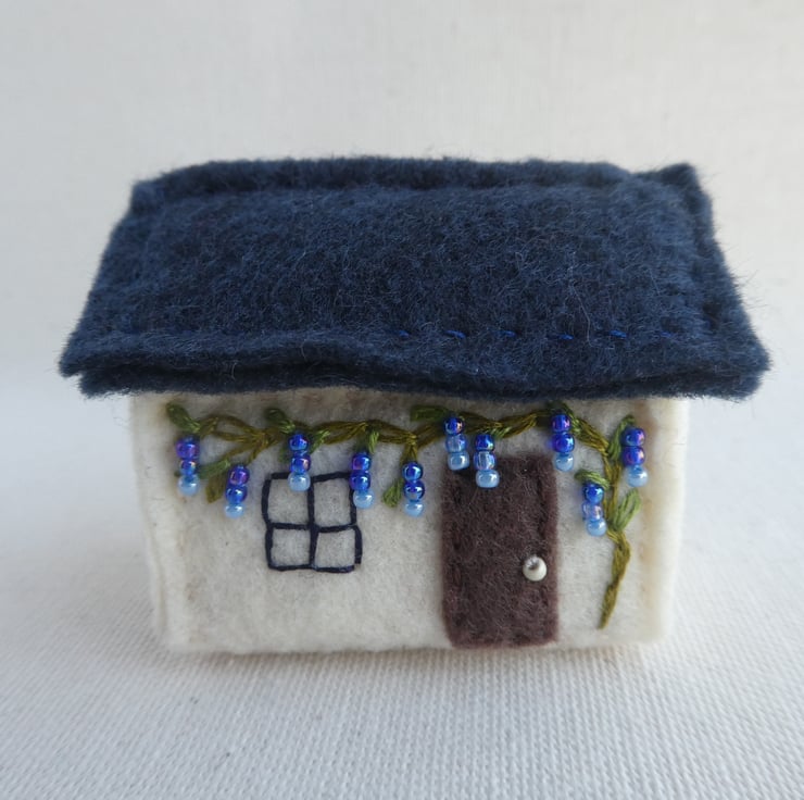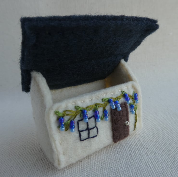 There is some wisteria flowering around the door and window, represented by hand stitched embroidery and tiny beads, and the felt door has a bead door handle.The walls, floor and roof have been strengthened with pieces of card between the layers of felt, all hand stitched together.