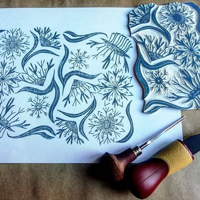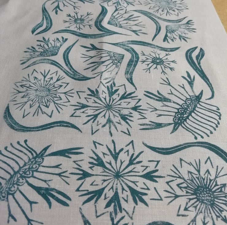 The fabric of this lampshade has been hand printed with a hand carved stamp inspired by wild cornflower.