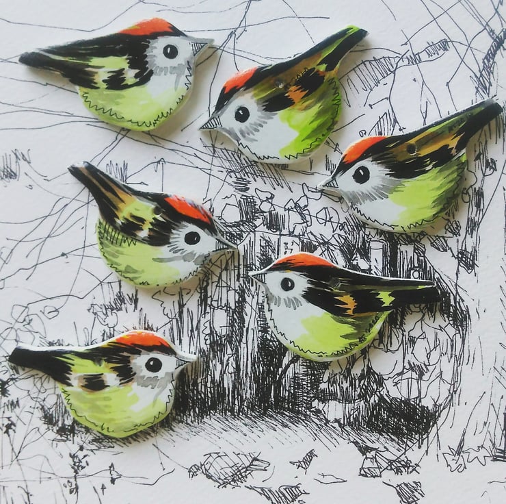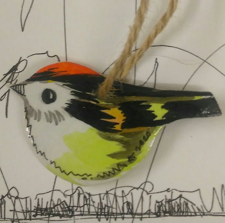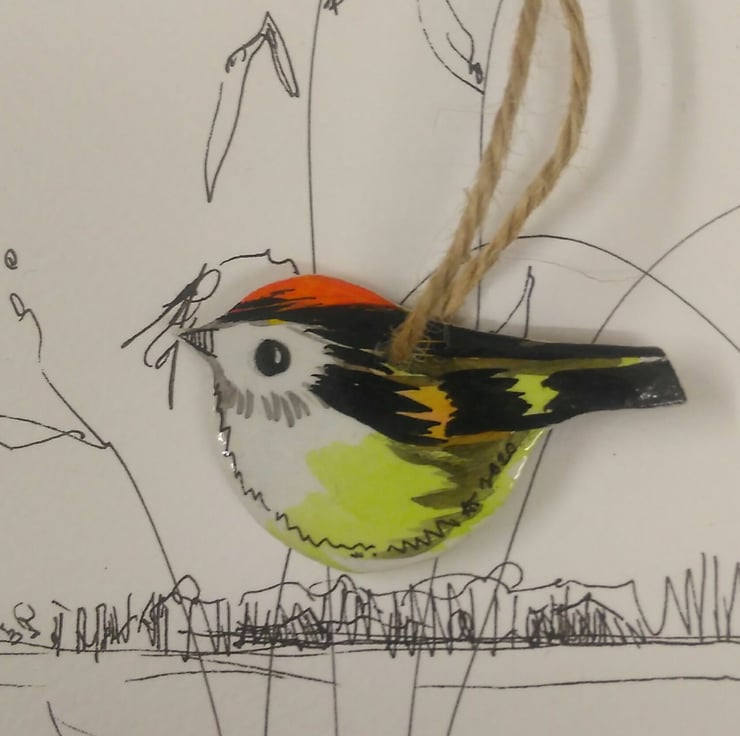Little wooden goldcrest hanging decoration. I love every part of the process from cutting out to the final coat of varnish. Although my favourite part is painting with acrylic inks and adding the detail to try and give each little bird it's own character.