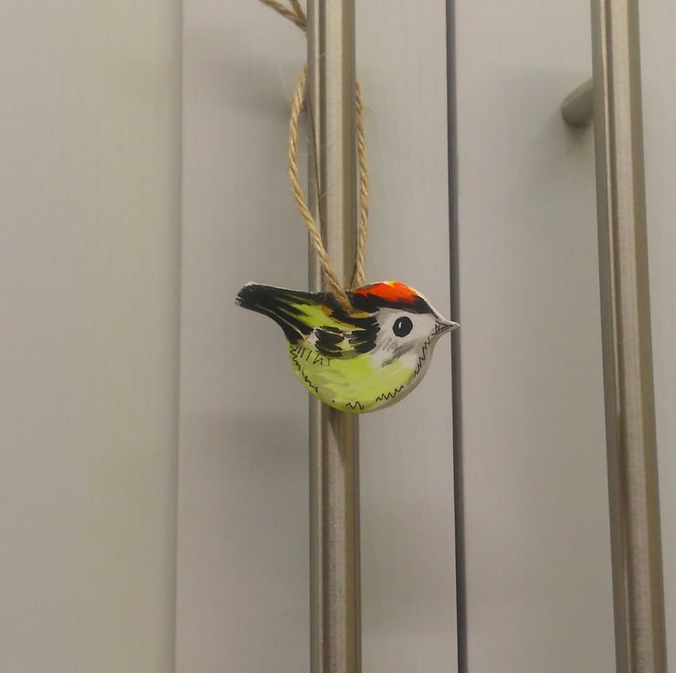 Hanging bird decoration, handmade wooden goldcrest, bird lovers gift