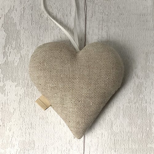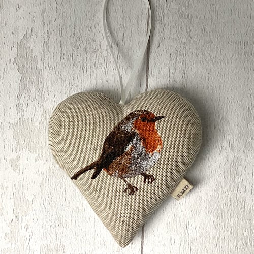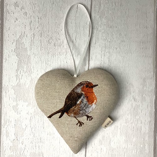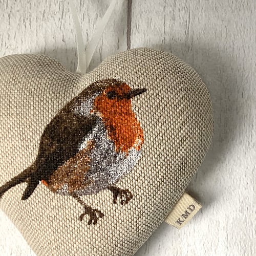Hanging heart in natural linen with a pretty robin print. 9cm wide by 16cm high to top of ribbon. Stuffed. This little heart makes the perfect mini gift or thank you. For Mum, teacher, friends or just the one you love!