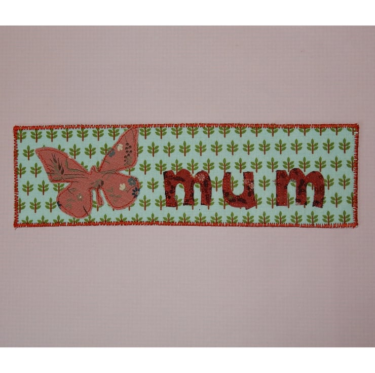 This is an attractive bookmark, measuring 2.5 x 8 inches. It is made from a leaf print fabric, with the addition of an applique butterfly and the word "Mum". The edge is stitched in matching thread.